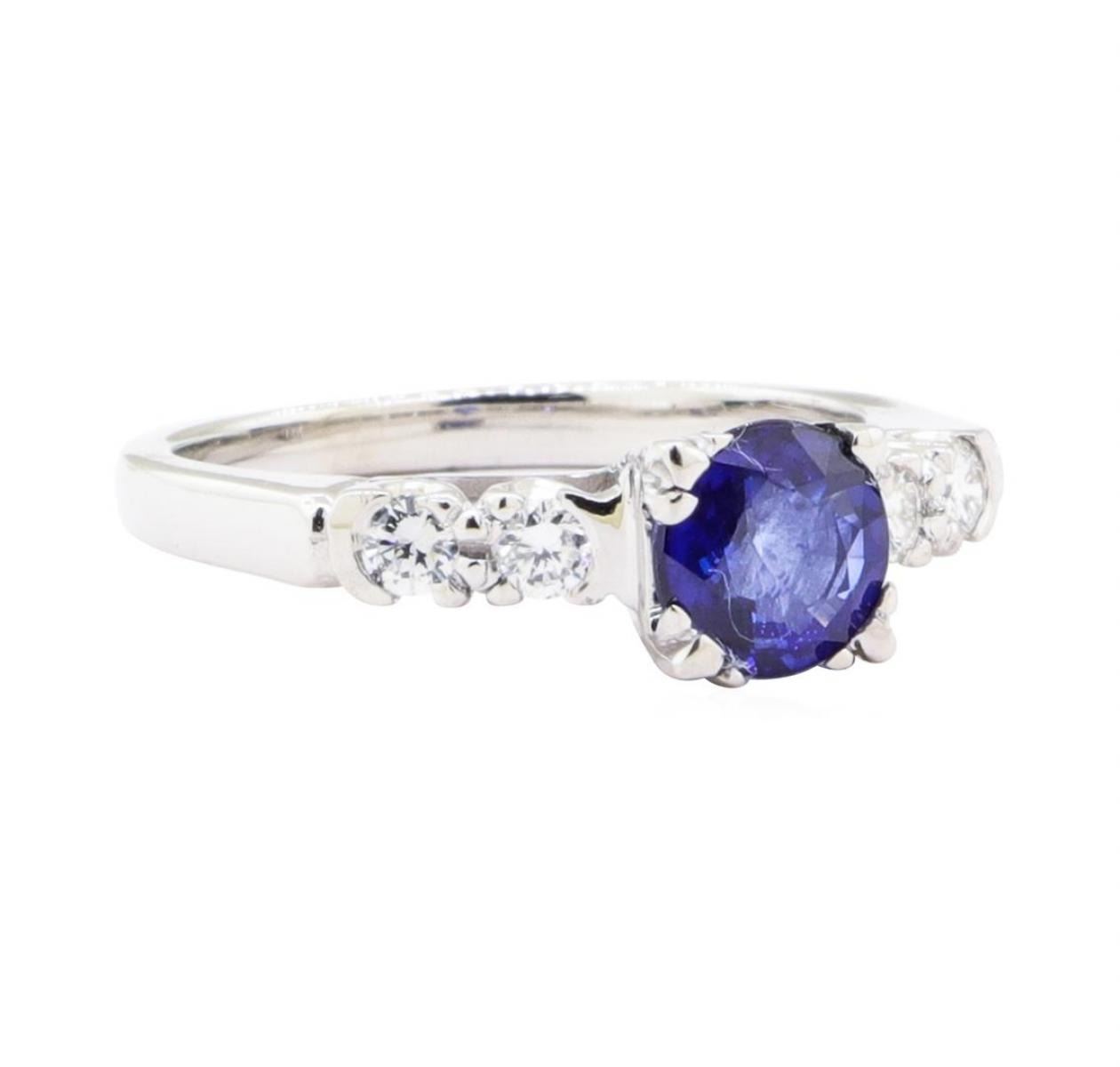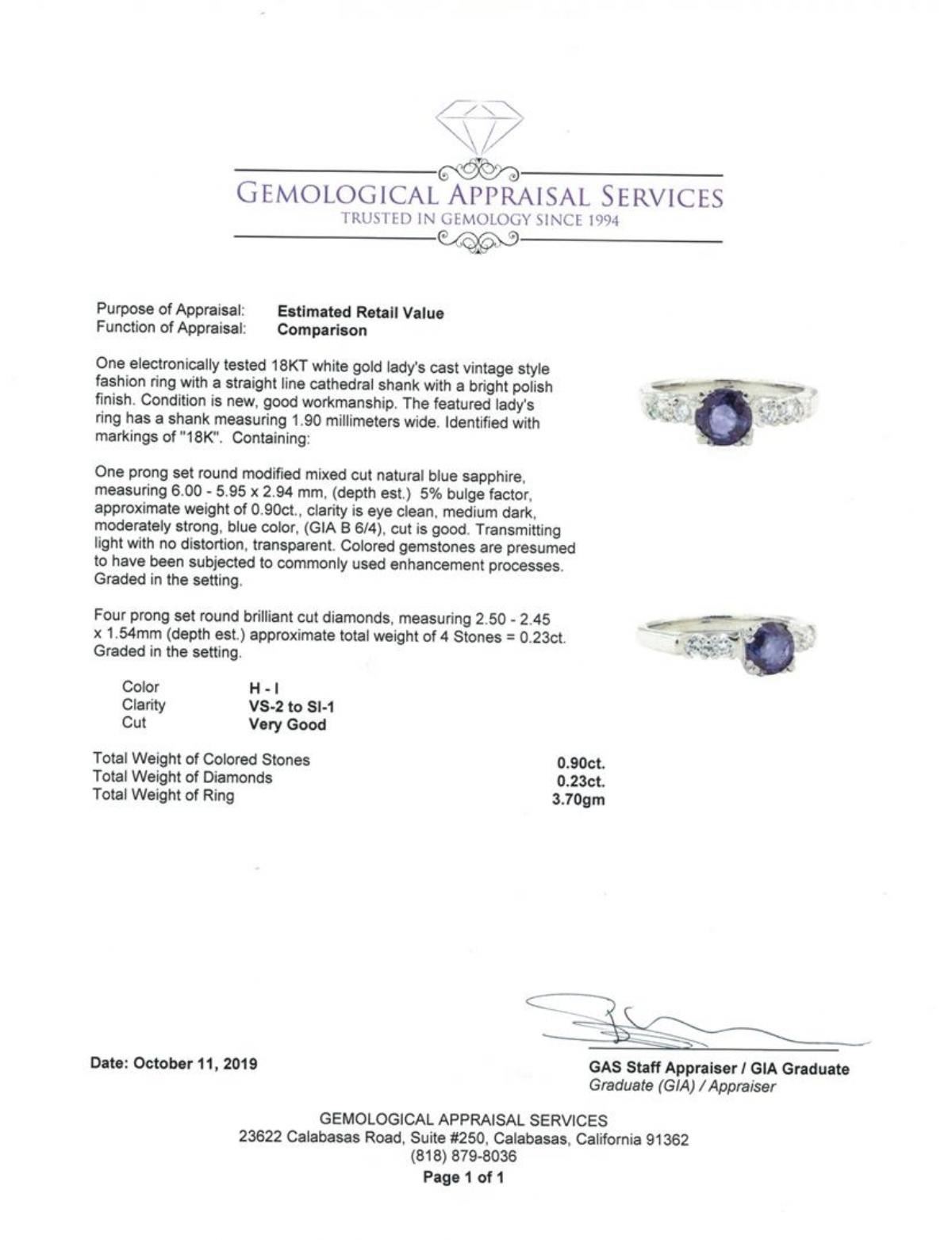 One electronically tested 18KT white gold lady's cast vintage style fashion ring with a straight line cathedral shank with a bright polish finish. The featured lady's ring has a shank measuring 1.90 millimeters wide. Identified with markings of '18K'. Condition is new, good workmanship. Containing: One prong set round modified mixed cut natural blue sapphire, measuring 6.00 - 5.95 x 2.94 mm, (depth est.) 5%. bulge factor, approximate weight of 0.90 ct., clarity is eye clean, medium dark, moderately strong, blue color, (GIA B 6/4), cut is good. Transmitting light with no distortion, transparent. Colored gemstones are presumed to have been subjected to commonly used enhancement processes. Graded in the setting. Four prong set round brilliant cut diamonds, measuring 2.50 - 2.45 x 1.54mm (depth est.) approximate total weight of 4 Stones = 0.23ct. Graded in the setting. Color H - I Clarity VS-2 to SI-1 Cut Very Good. Total Weight of Colored Stones 0.90 ct.. Total Weight of Diamonds 0.23ct.. Total Weight of Ring 3.70gm GAS Appraised at $2690.00. GAS Appraised.