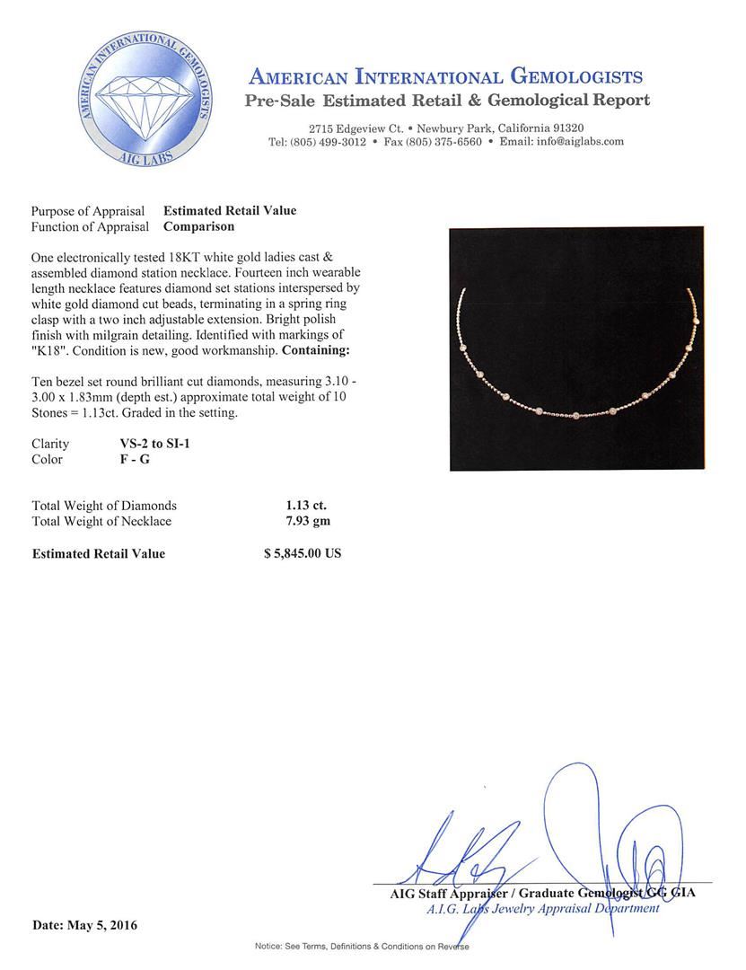 One electronically tested 18KT white gold ladies cast & assembled diamond station necklace. Fourteen inch wearable length necklace features diamond set stations interspersed by white gold diamond cut beads, terminating in a spring ring clasp with a two inch adjustable extension. Bright polish finish with milgrain detailing. Identified with markings of K18. Condition is new, good workmanship. Containing: Ten bezel set round brilliant cut diamonds, measuring 3.10 - 3.00 x 1.83mm (depth est.) approximate total weight of 10 Stones = 1.13ct. Graded in the setting. Clarity: VS-2 to SI-1. Color: F - G. Total Weight of Diamonds 1.13ct. Total Weight of Necklace 7.93gm. AIG Appraised at $5,845.00.