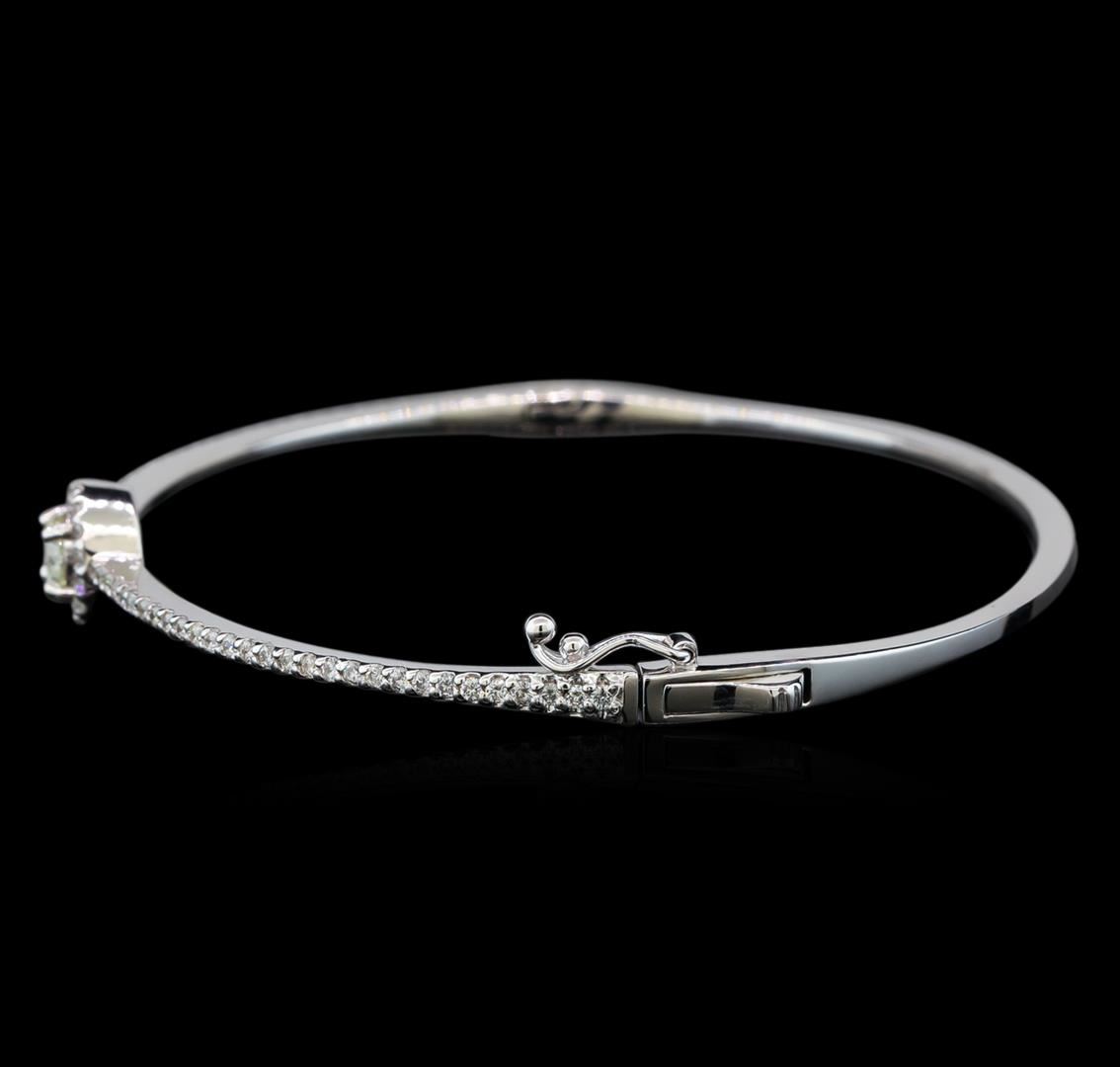 One electronically tested 14KT white gold lady's combination cast & assembled fashion bangle bracelet with a tongue clasp with foldover safety with a bright polish finish. The featured lady's bracelet measures approximately 7 inches in length. Identified with markings of 'K14'. Condition is new, good workmanship. Containing: One prong set round brilliant cut diamond, measuring 4.86 - 4.84 x 2.93mm (depth est.) approximate weight of 0.42ct. Graded in the setting. Clarity SI-1. Color: H Cut Very Good Seventy-Two prong set round brilliant cut diamonds, measuring 1.40 - 1.35 x 0.86mm (depth est.) approximate total weight of 72 Stones = 0.72ct. Graded in the setting. Clarity SI-1 to I-1. Color: H - I Cut Good. Total Weight of Diamonds 1.14ct.. Total Weight of Bangle Bracelet 9.70gm. GAS Appraised at $6,490.00.