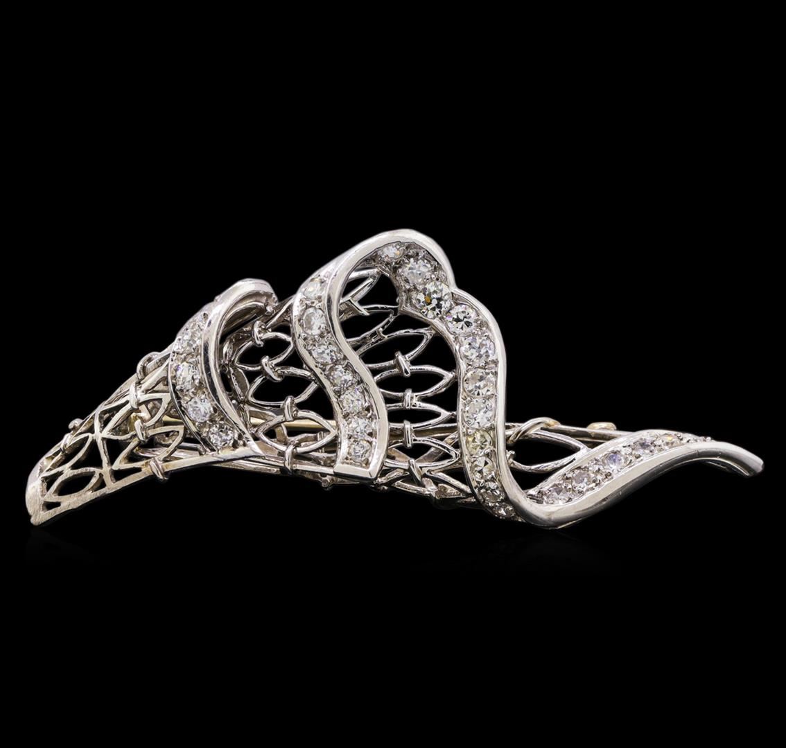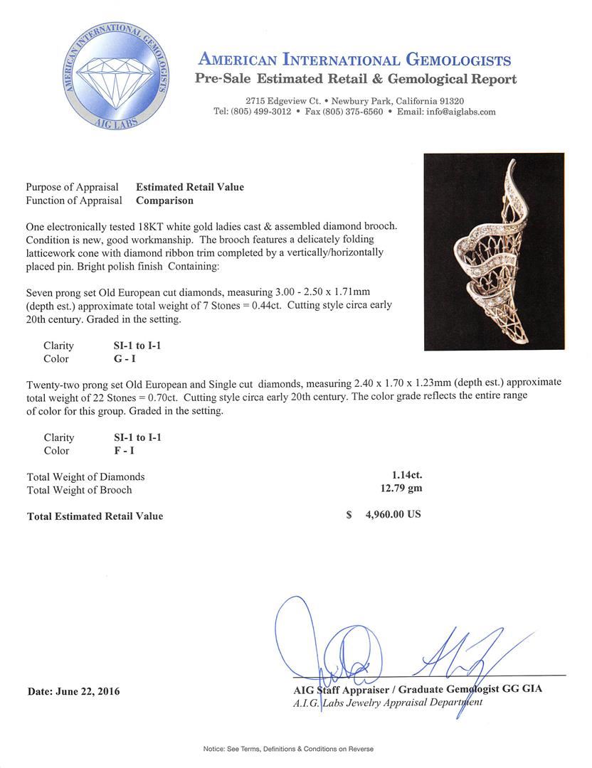 One electronically tested 18KT white gold ladies cast & assembled diamond brooch. The brooch features a delicately folding latticework cone with diamond ribbon trim completed by a vertically/horizontally placed pin. Bright polish finish Condition is new, good workmanship. Containing: Seven prong set Old European cut diamonds, measuring 3.00. - 2.50 x 1.71mm (depth est.) approximate total weight of 7 Stones = 0.44ct. Cutting style circa early 20th century. Graded in the setting. Clarity: SI-1 to I-1 . Color: G - I Twenty-Two prong set Old European and Single cut diamonds, measuring 2.40 x 1.70 x 1.23mm (depth est.) approximate total weight of 22 Stones = 0.70ct. Cutting style circa early 20th century. The color grade reflects the entire range of color for this group. Graded in the setting. Clarity: SI-1 to I-1 . Color: F - I. Total Weight of Diamonds 1.14ct.. Total Weight of Brooch 12.79gm. AIG Appraised at $4,960.00.