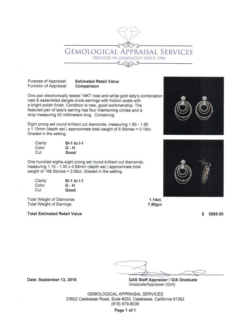 One pair electronically tested 14KT rose and white gold lady's combination cast & assembled dangle circle earrings with friction posts with a bright polish finish. The featured pair of lady's earring has four intertwining circles and a drop measuring 30 millimeters long. Condition is new, good workmanship. Containing: Eight prong set round brilliant cut diamonds, measuring 1.90 - 1.80 x 1.15mm (depth est.) approximate total weight of 8 Stones = 0.19ct. Graded in the setting. Clarity SI-1 to I-1. Color: G - H Cut Good One Hundred Eighty-Eight prong set round brilliant cut diamonds, measuring 1.15 - 1.05 x 0.68mm (depth est.) approximate total weight of 188 Stones = 0.95ct. Graded in the setting. Clarity SI-1 to I-1. Color: G - H Cut Good. Total Weight of Diamonds 1.14ct.. Total Weight of Earrings 7.80gm GAS Appraised at $5,585.00.
