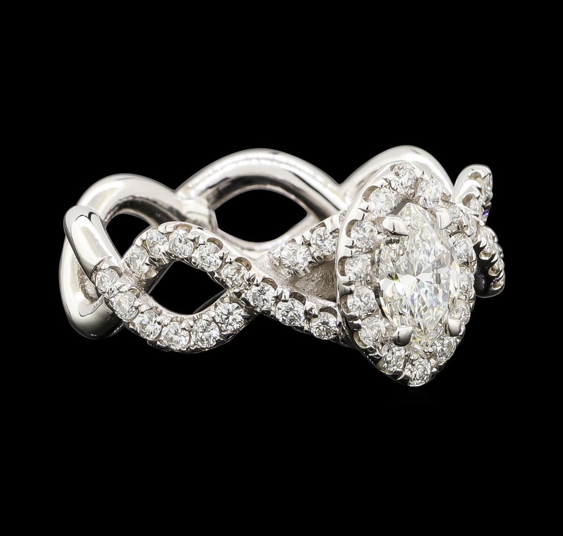 One electronically tested 14KT white gold lady's cast wedding ring with a overlapping split shank with a bright polish finish. The featured lady's ring has a shank measuring 3.40 millimeters wide. Identified with markings of '14K'. Condition is new, good workmanship. Containing: One prong set marquise shaped cut diamond, measuring 7.14 x 4.55 x 2.95mm (depth est.) approximate weight of 0.56ct. Graded in the setting. Clarity SI-2. Color: H Cut Good Forty-Six prong set round brilliant cut diamonds, measuring 1.50 - 1.45 x 0.92mm (depth est.) approximate total weight of 46 Stones = 0.58ct. Graded in the setting. Clarity SI-1 to SI-2. Color: G - H Cut Very Good. Total Weight of Diamonds 1.14ct.. Total Weight of Ring 5.10gm. GAS Appraised at $4,895.00.