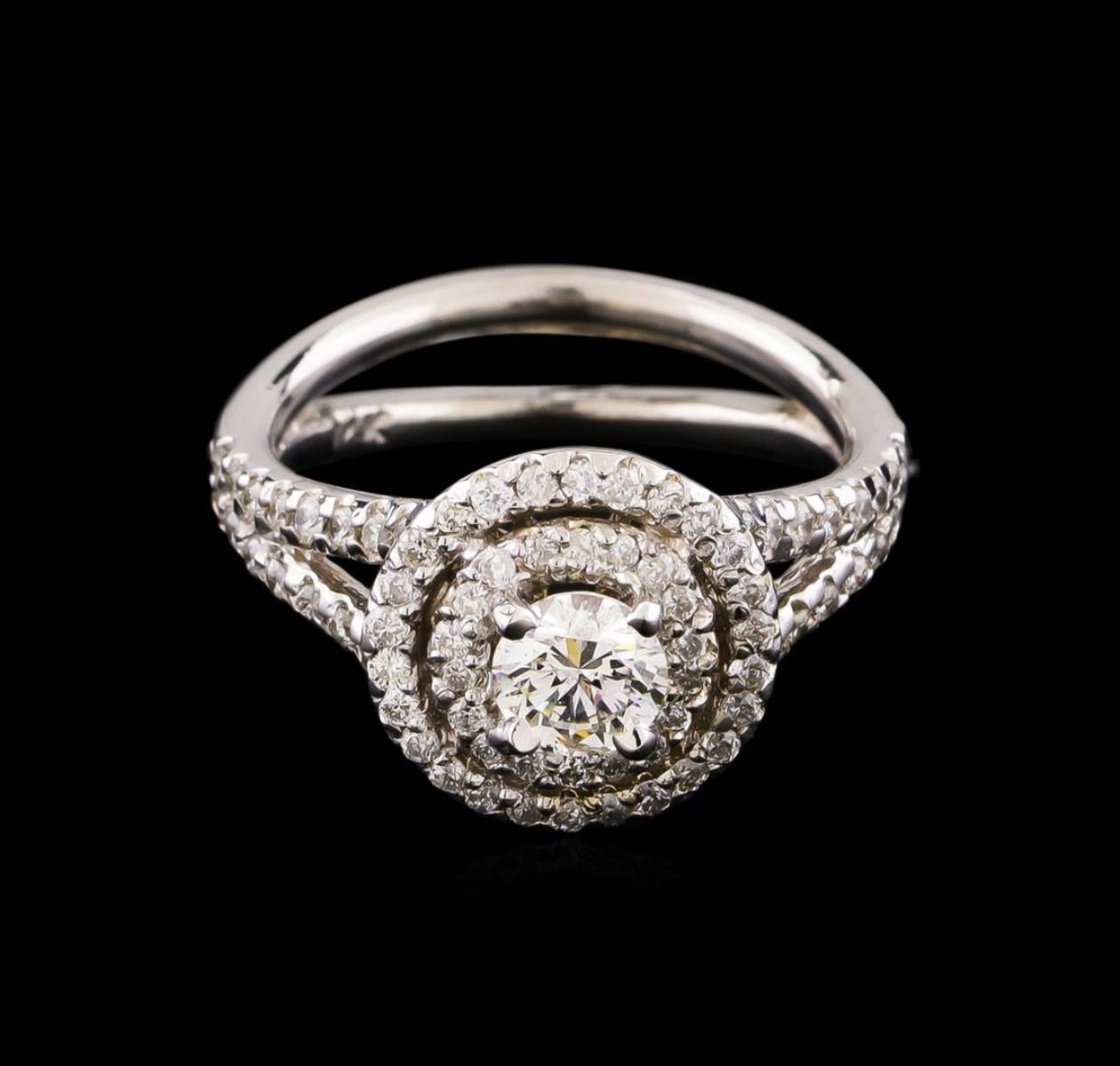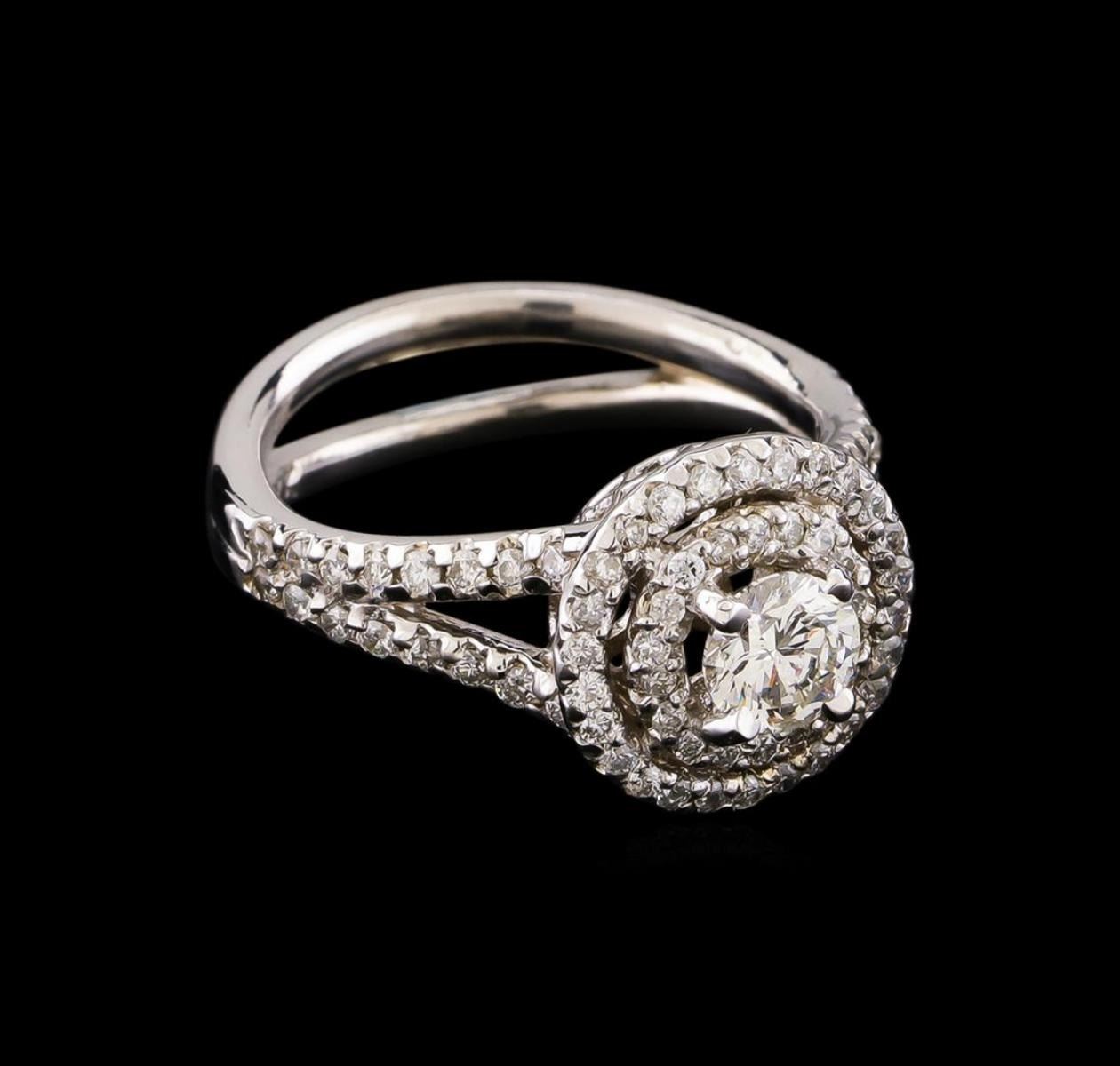 One electronically tested 14KT white gold lady's cast wedding ring with a split shank double basket halo with a bright polish finish. The featured lady's ring has a double shank measuring 3.20 millimeters wide. Identified with markings of "14K". Condition is new, good workmanship. Containing: One prong set round brilliant cut diamond, measuring 5.05 - 5.02 x 3.28mm (depth est.) approximate weight of 0.51ct. Graded in the setting. Clarity: SI-2. Color: Good Thirty-Two prong set round brilliant cut diamonds, measuring 1.40 - 1.30 x 0.84mm (depth est.) approximate total weight of 32 Stones = 0.30 ct. Graded in the setting. Clarity: SI-1 to SI-2. Color: G - Good Forty-Four prong set round brilliant cut diamonds, measuring 1.30 - 1.20 x 0.78mm (depth est.) approximate total weight of 44 Stones = 0.33ct. Graded in the setting. Clarity: SI-1 to SI-2. Color: H - I. Cut Good. Total Weight of Diamonds 1.14ct. Total Weight of Ring 5.60gm. GAS Appraised at $6,220.00.