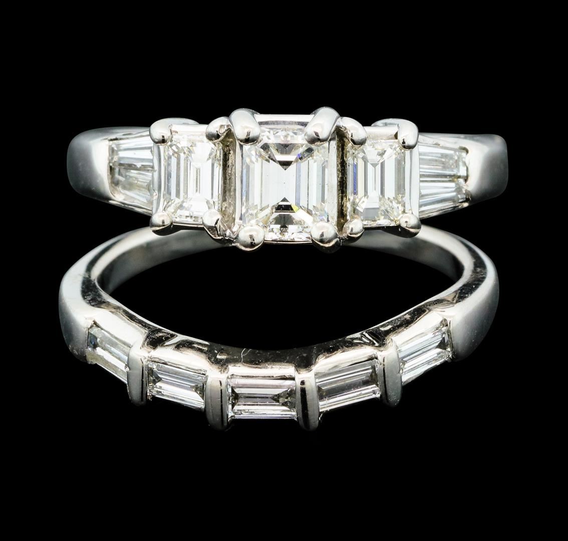 One set electronically tested 14KT white gold lady's cast wedding ring & wedding band with a cathedral shank with a bright polish finish. The featured lady's ring and band have a double shank measuring 3.72 millimeters wide. Identified with markings of '14K'. Condition is new, good workmanship. Containing: One prong set emerald cut diamond, measuring 4.56 x 3.44 x 2.30mm (depth est.) approximate weight of 0.33ct. Graded in the setting. Clarity SI-2. Color: H Cut Very Good Two prong set emerald cut diamonds, measuring 3.65 x 2.70 x 1.81mm (depth est.) approximate total weight of 2 Stones = 0.33ct. Graded in the setting. Clarity VS-1 to VS-2. Color: H - I Cut Very Good Four channel set baguette cut (tapered) diamonds, measuring from 3.20 x 1.40 x 1.19mm (depth est.) to 3.30 x 1.50 x 1.28mm (depth est.) approximate total weight of 4 Stones = 0.22ct. Graded in the setting. Clarity VS-2 to SI-1. Color: H - I Cut Very Good Five channel set baguette cut diamonds, measuring from 2.70 x 1.40 x 1.19mm (depth est.) to 3.00 x 1.65 x 1.40mm (depth est.) approximate total weight of 5 Stones = 0.26ct. Graded in the setting. Clarity VS-2 to SI-1. Color: H - I Cut Very Good. Total Weight of Diamonds 1.14ct.. Total Weight of Ring & Wedding Band 5.90gm GAS Appraised at $4,935.00.