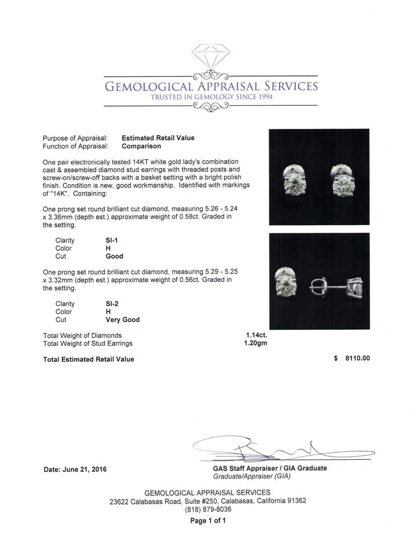 One pair electronically tested 14KT white gold lady's combination cast & assembled diamond stud earrings with threaded posts and screw-on/screw-off backs with a basket setting with a bright polish finish. Identified with markings of "14K". Condition is new, good workmanship. Containing: One prong set round brilliant cut diamond, measuring 5.26 - 5.24 x 3.36mm (depth est.) approximate weight of 0.58ct. Graded in the setting. Clarity: SI-1. Color: Good One prong set round brilliant cut diamond, measuring 5.29 - 5.25 x 3.32mm (depth est.) approximate weight of 0.56ct. Graded in the setting. Clarity: SI-2. Color: Very Good. Total Weight of Diamonds 1.14ct. Total Weight of Stud Earrings 1.20gm. GAS Appraised at $8,110.00.