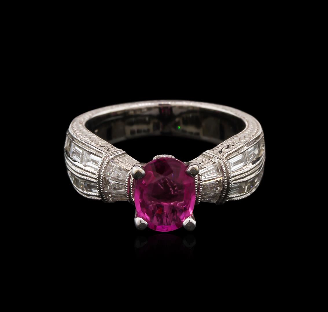 One electronically tested 18KT white gold ladies cast pink sapphire and diamond ring. The featured pink sapphire is supported by elaborate diamond set shoulders, completed by a patterned four millimeter wide band. Bright polish finish with milgrain detailing. Identified with markings of "18K". Condition is new, good workmanship. Containing: One prong set oval mixed cut natural pink sapphire, measuring 8.00 x 6.10 x 2.40mm, 6% bulge factor, approximate weight of 1.14ct., clarity is moderately included, medium dark, moderately strong, pink color, (GIA Pk 6/4), cut is good. Transmitting light with a minimum of distortion, transparent. Naturally occurring internal & external characteristics are present. Graded in the setting. Twelve channel set baguette cut diamonds, measuring from 2.90 x 1.50 x 1.05mm (depth est.) to 3.00 x 1.50 x 1.05mm (depth est.) approximate total weight of 12 Stones = 0.51ct. Graded in the setting. Clarity: VS-1 to VS-2. Color: G - H Six channel set baguette cut (tapered) diamonds, measuring from 2.80 x 1.40 x 0.98mm (depth est.) to 3.00 x 1.40 x 0.98mm (depth est.) approximate total weight of 6 Stones = 0.21ct. Clarity: VS-1 to VS-2. Color: G - H Two bezel set round brilliant cut diamonds, measuring 1.50 - 1.50 x 0.90mm (depth est.) approximate total weight of 2 Stones = 0.03ct. Graded in the setting. Clarity: SI-1. Color: G. Total Weight of Colored Stones 1.14ct. Total Weight of Diamonds 0.75ct. Total Weight of Ring 8.15gm. AIG Appraised at $6,335.00.