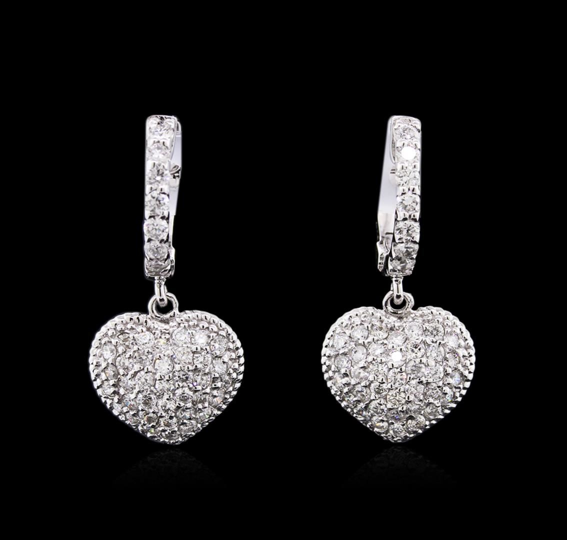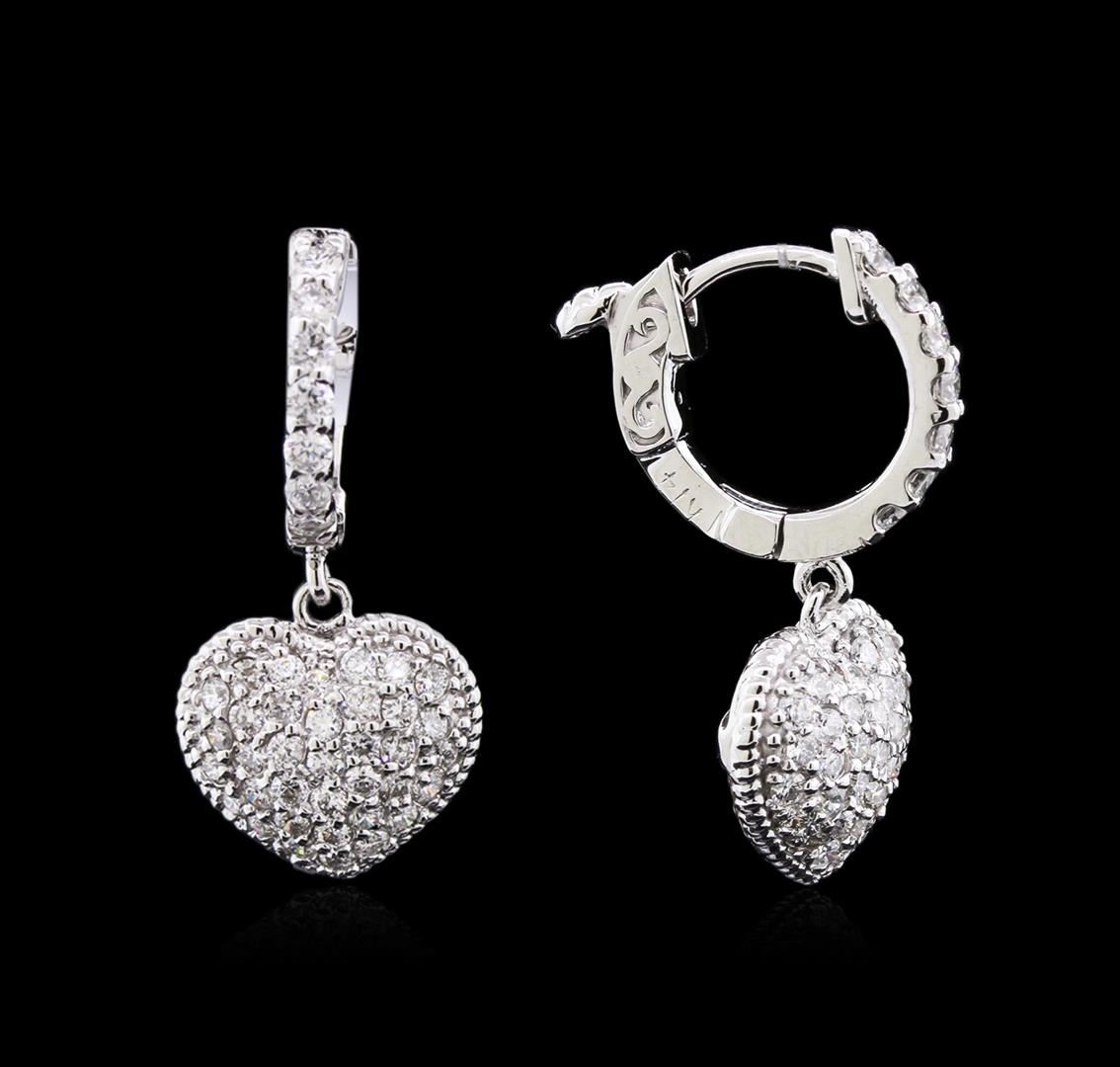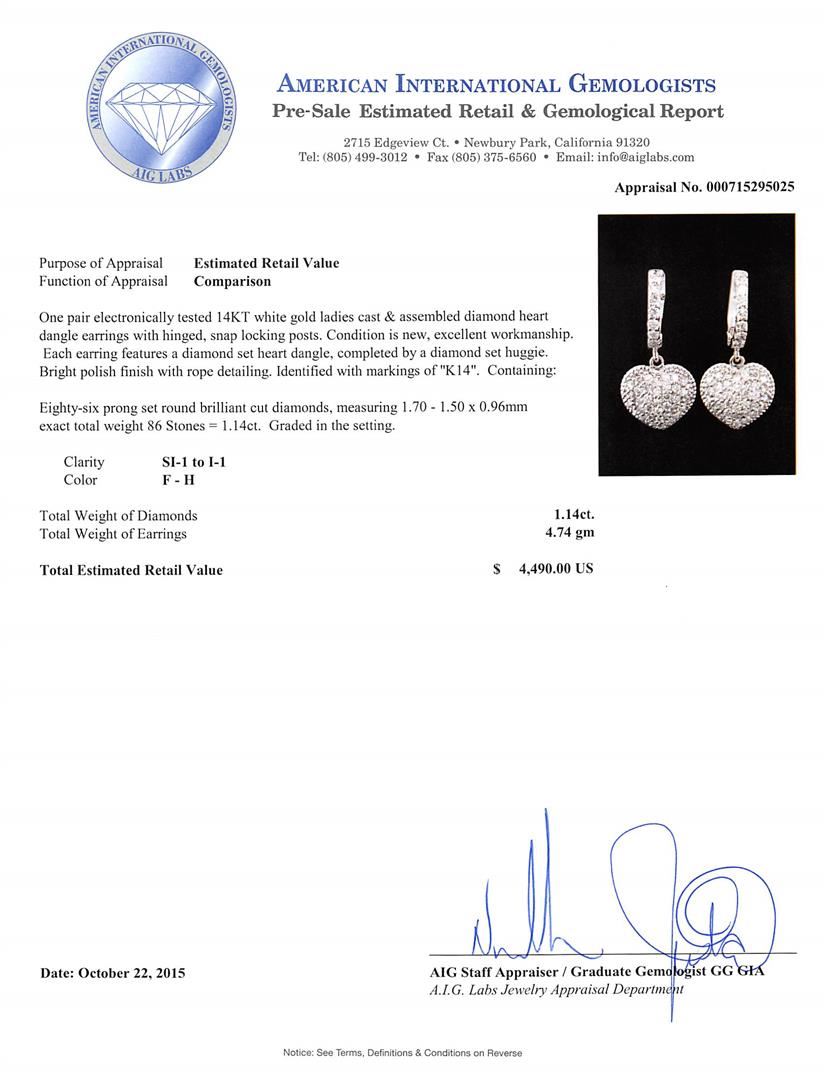 One pair electronically tested 14KT white gold ladies cast & assembled diamond heart dangle earrings with hinged, snap locking posts. Each earring features a diamond set heart dangle, completed by a diamond set huggie. Bright polish finish with rope detailing. Identified with markings of "K14". Condition is new, excellent workmanship. Containing: Eighty-Six prong set round brilliant cut diamonds, measuring 1.70 - 1.50 x 0.96mm exact total weight 86 Stones = 1.14ct. Graded in the setting. Clarity: SI-1 to I-1. Color: F - H. Total Weight of Diamonds 1.14ct. Total Weight of Earrings 4.74gm. AIG Appraised at $4,490.00.
