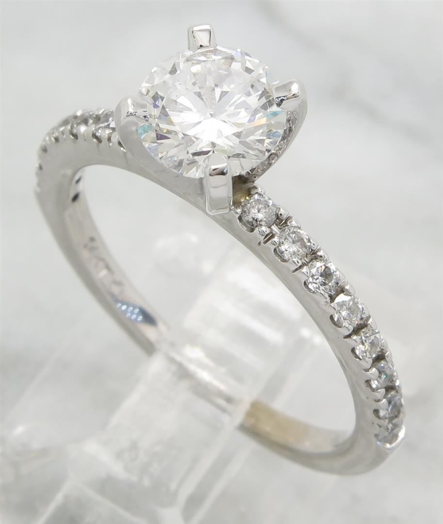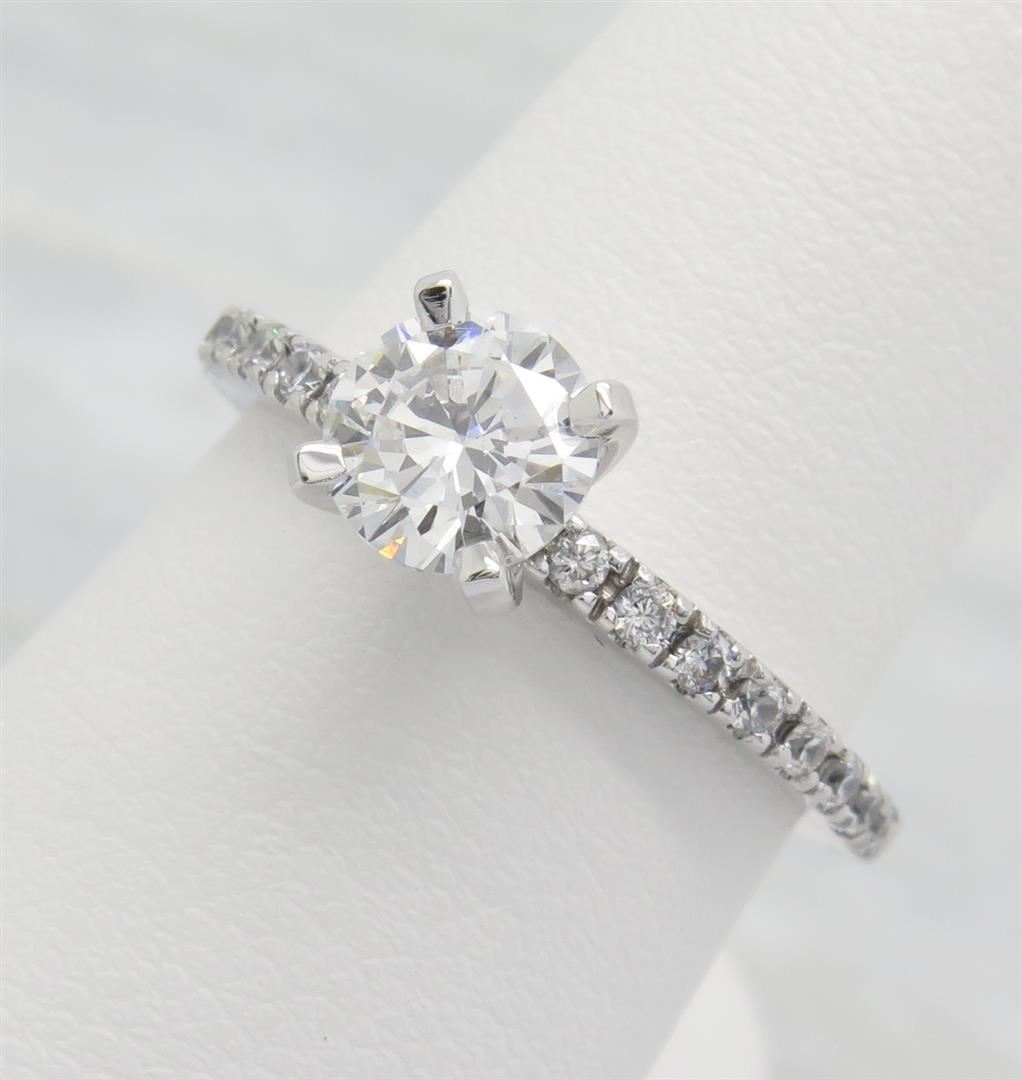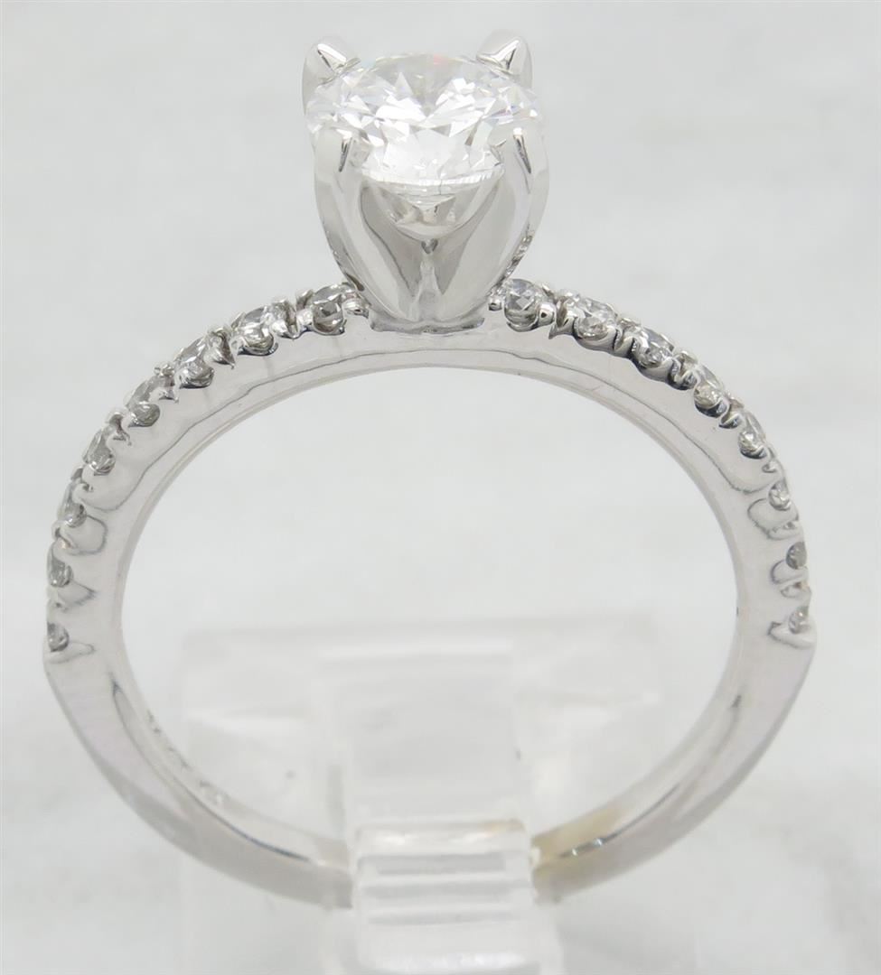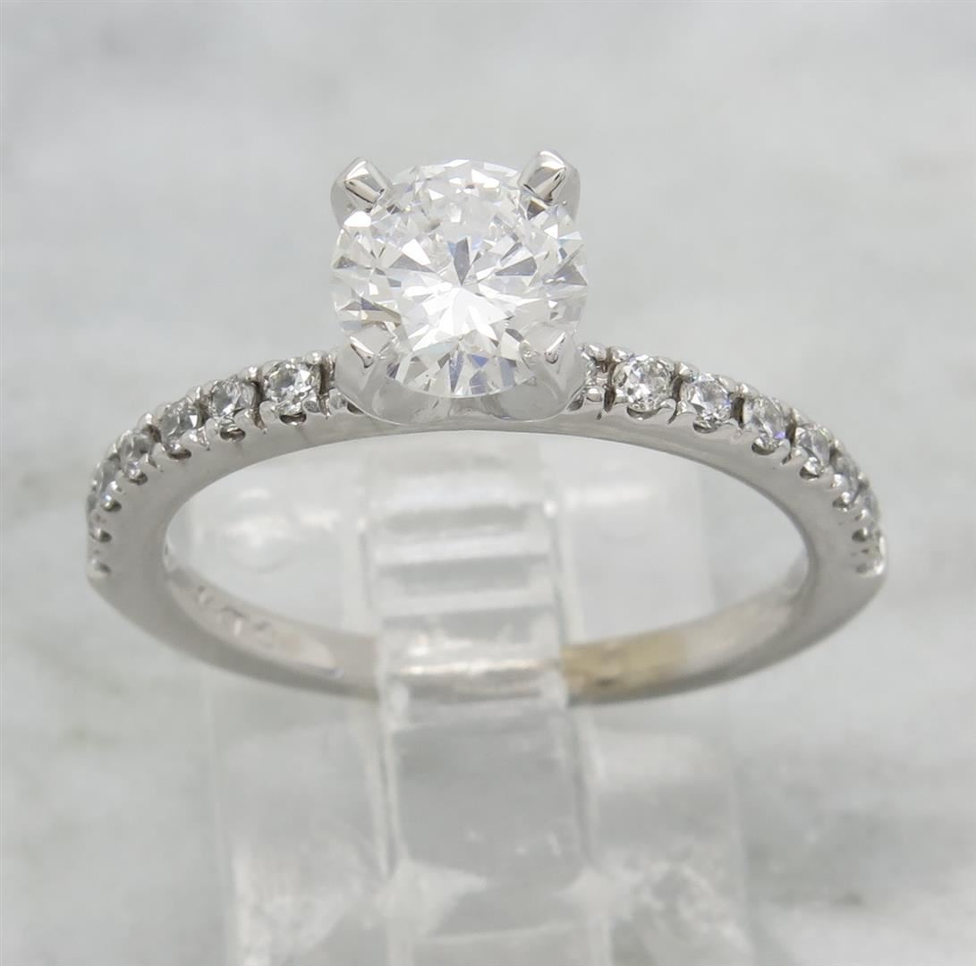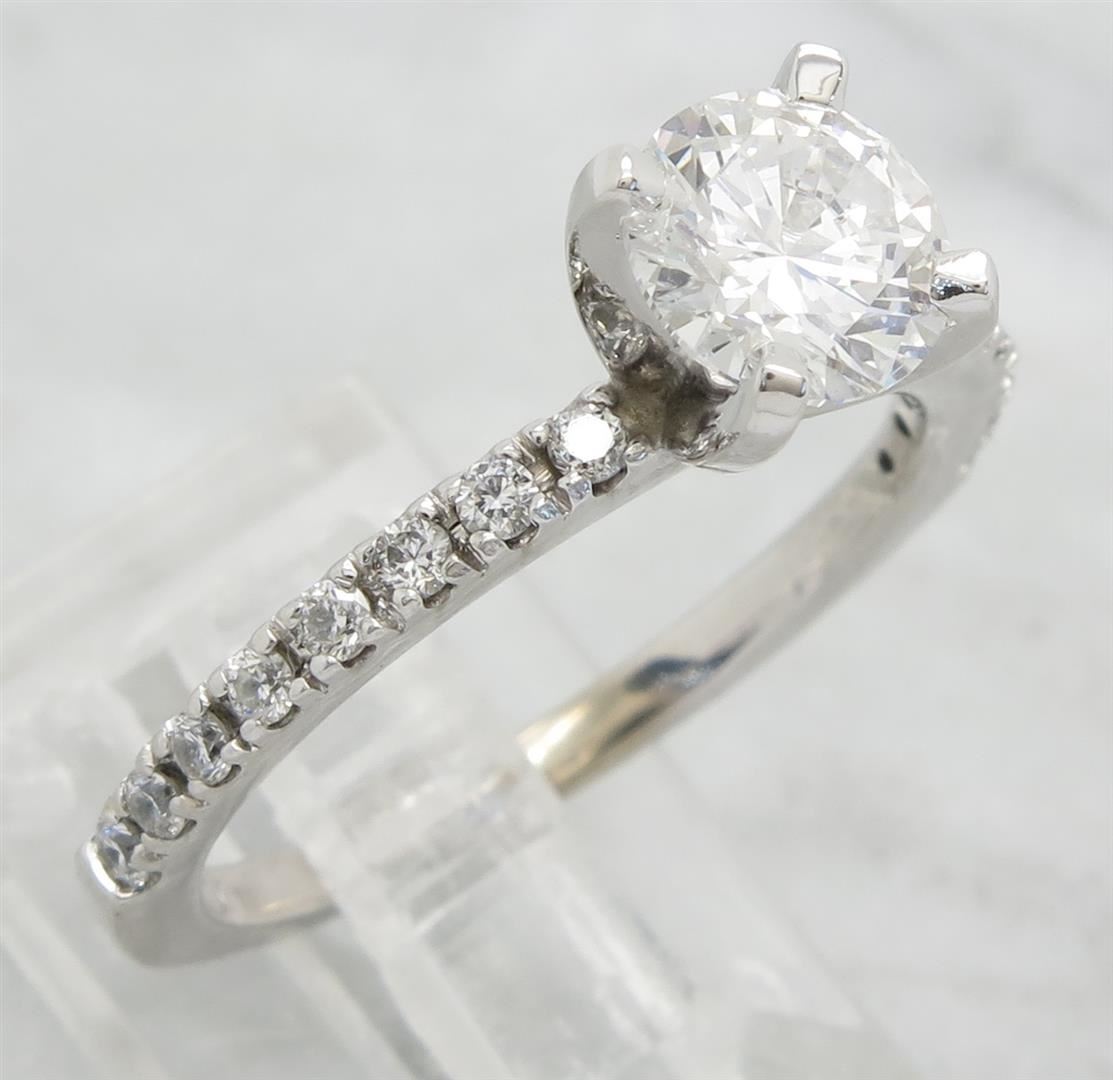 One tested 14K white gold certified diamond ring. Containing: One GSI Certified Round Brilliant Cut Diamond. Size: .90CT, Clarity: SI2, Color: F. 16 Round Brilliant Cut Diamonds. Approximate total diamond weight: 1.14CTW. Diamonds are graded in the mounting, unless otherwise stated. Weight: 3.1 grams. Size: 6.0 GSI Appraised.