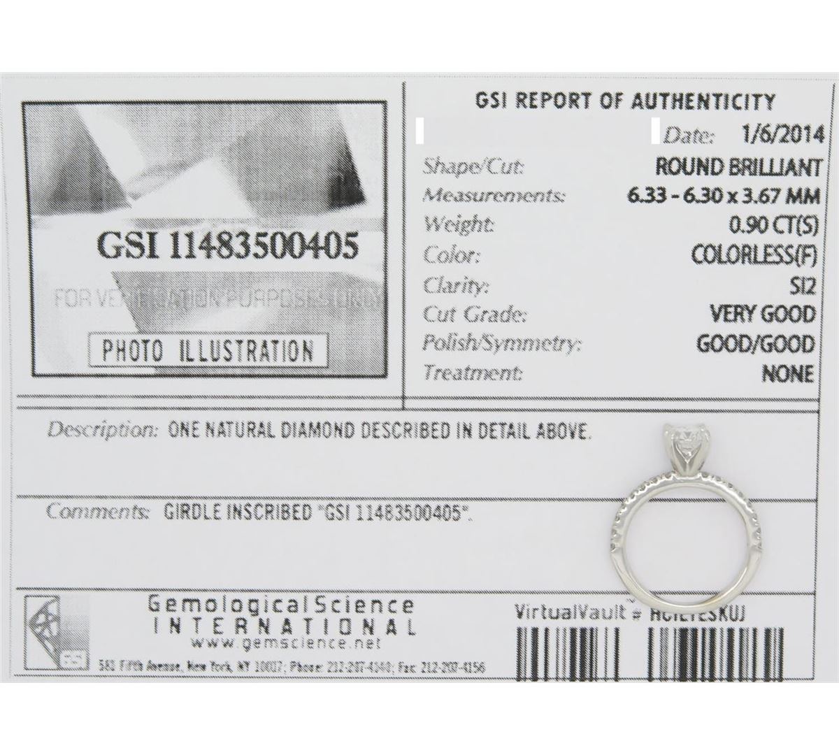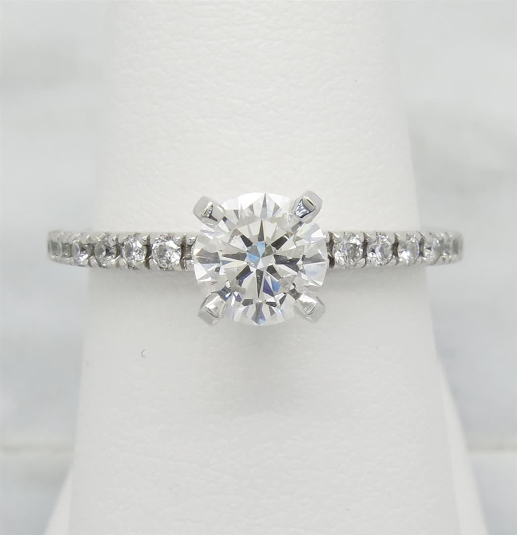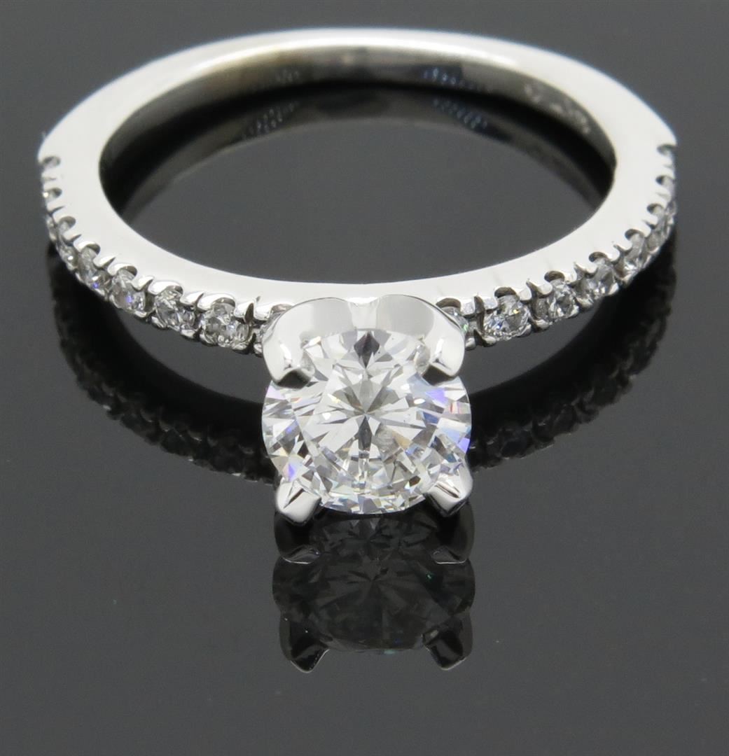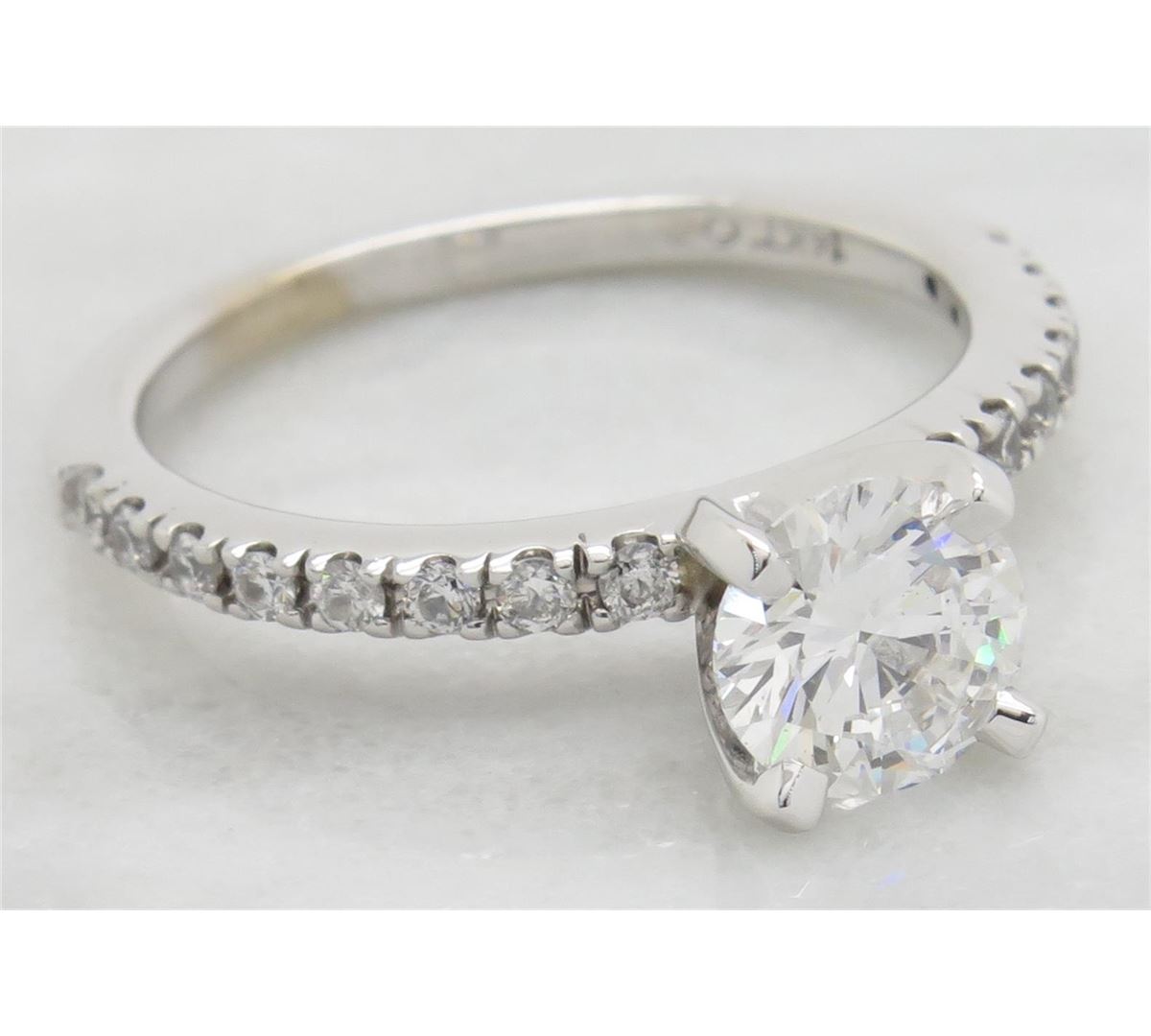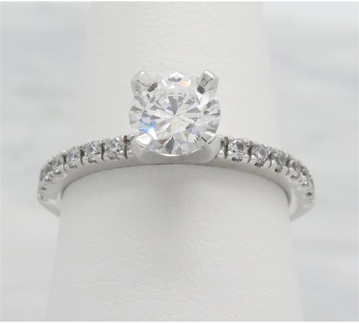 One tested 14K white gold certified diamond ring. Containing: One GSI Certified Round Brilliant Cut Diamond. Size: .90CT, Clarity: SI2, Color: F. 16 Round Brilliant Cut Diamonds. Approximate total diamond weight: 1.14CTW. Diamonds are graded in the mounting, unless otherwise stated. Weight: 3.1 grams. Size: 6.0 GSI Appraised.
