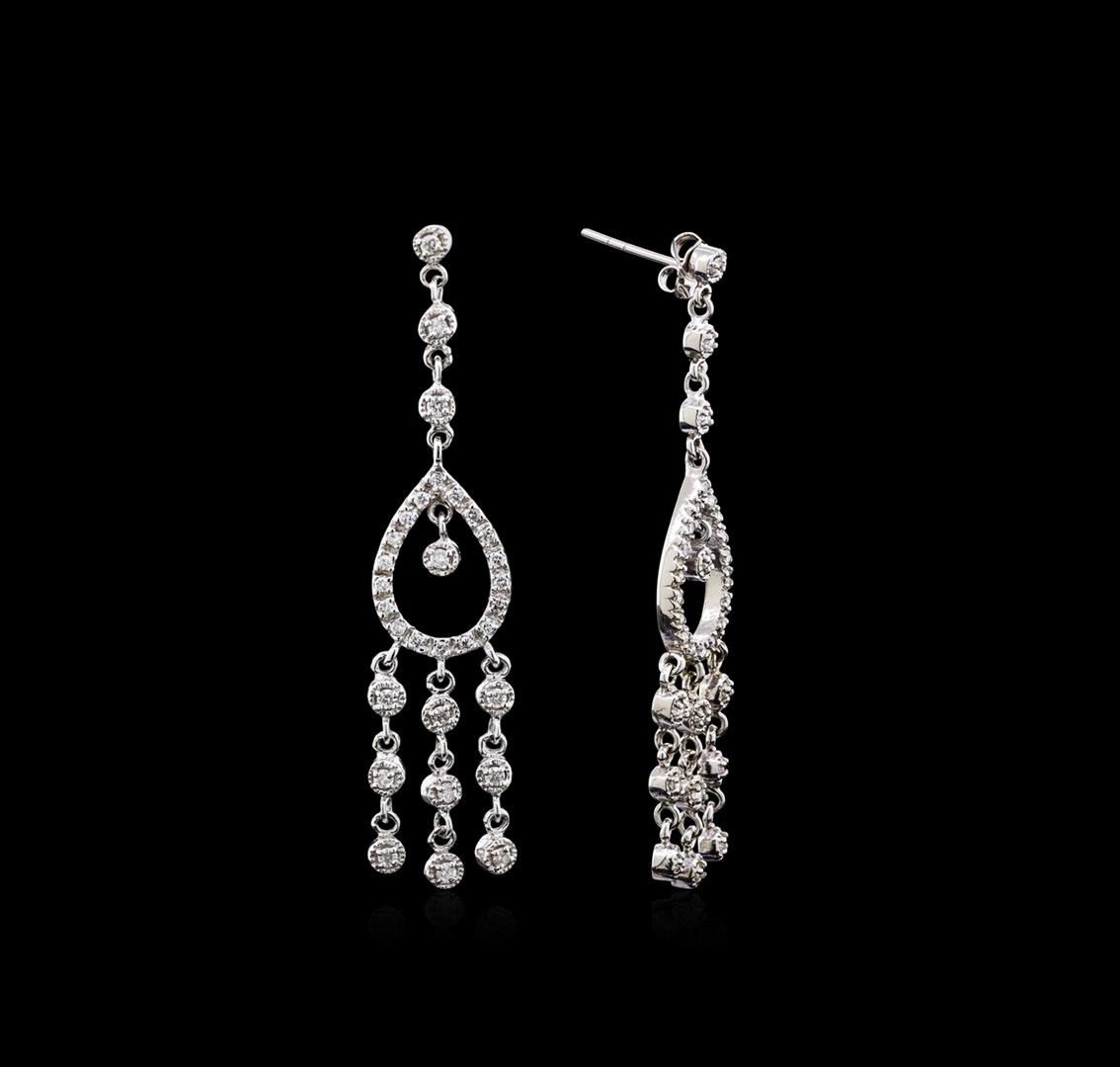 One 18KT white gold 1.15ctw diamond chandeller earrings. Metal: 18KT solid white gold. Face Measurements: 13 x 59mm. Finish: Bright polish. Total Item Weight: 9.8 grams. Markings: Stamped 18KT. Containing: 62 round Diamonds with a total weight of 1.15ct. Measuring: 1.3 - 1.7mm. Treatment: None. Setting: Prong. Color: G - H. Clarity: SI1 -SI2. Cut: Very good. Excellent workmanship. Gemstones graded in the setting. BHGL Appraised at $5,400.00.