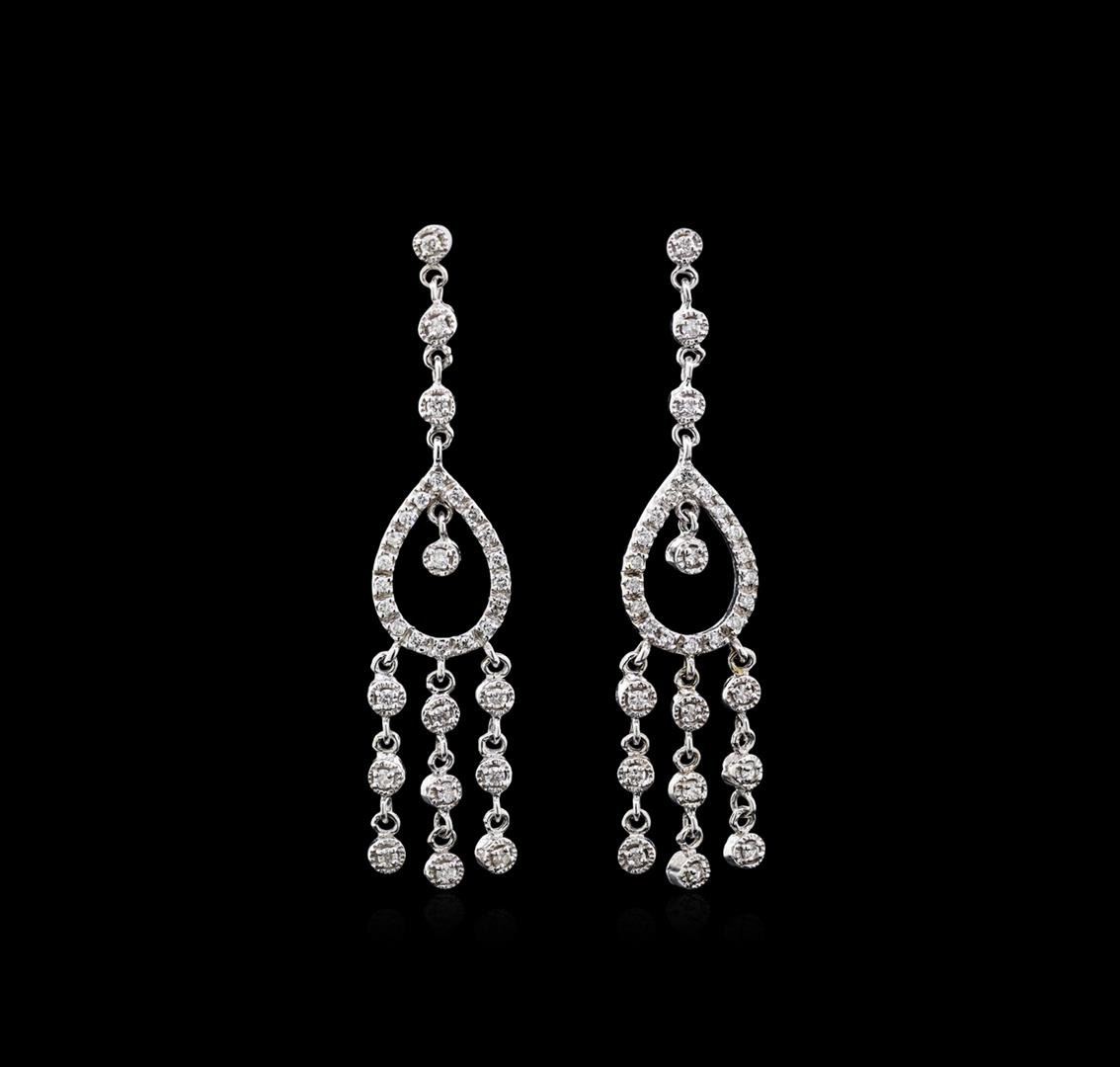 One Pair 18KT white gold 1.15ctw diamond chandeller earrings. Metal: 18KT solid white gold. Face Measurements: 13 x 59mm. Finish: Bright polish. Total Item Weight: 9.8 grams. Markings: Stamped 18KT. Containing: 62 round Diamonds with a total weight of 1.15ct. Measuring: 1.3 - 1.7mm. Treatment: None. Setting: Prong. Color: G - H. Clarity: SI1 -SI2. Cut: Very good. Excellent workmanship. Gemstones graded in the setting. BHGL Appraised.