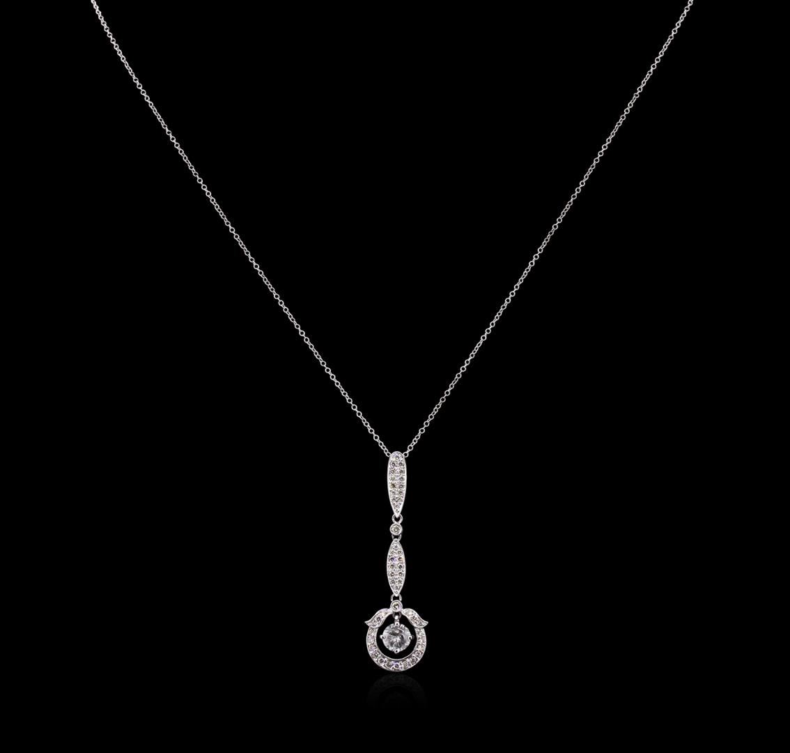 One electronically tested 14-18KT white gold lady's combination cast & assembled drop style pendant & chain 18.0" long, 1mm round cable link with a spring ring clasp with a bright polish with milgrain detailing finish. The featured 18K lady's pendant has an attached 14K white gold chain. Identified with markings of "18K / 14K". Condition is new, good workmanship. Containing: One prong set round brilliant cut diamond, measuring 5.61 - 5.58 x 3.10mm (depth est.) approximate weight of 0.62ct. Graded in the setting. Clarity: I-1. Color: I. Cut Good Two bezel set round brilliant cut diamonds, measuring 1.60 - 1.55 x 1.03mm (depth est.) approximate total weight of 2 Stones = 0.03ct. Graded in the setting. Clarity: VS-2 to SI-1. Color: H - I. Cut Very Good Forty-Five prong set round brilliant cut diamonds, measuring 1.50 - 1.30 x 0.91mm (depth est.) approximate total weight of 45 Stones = 0.50ct. Graded in the setting. Clarity: VS-2 to SI-1. Color: I - Good. Total Weight of Diamonds 1.15ct. Total Weight of Pendant & Chain 4.00gm GAS Appraised at $6,175.00.