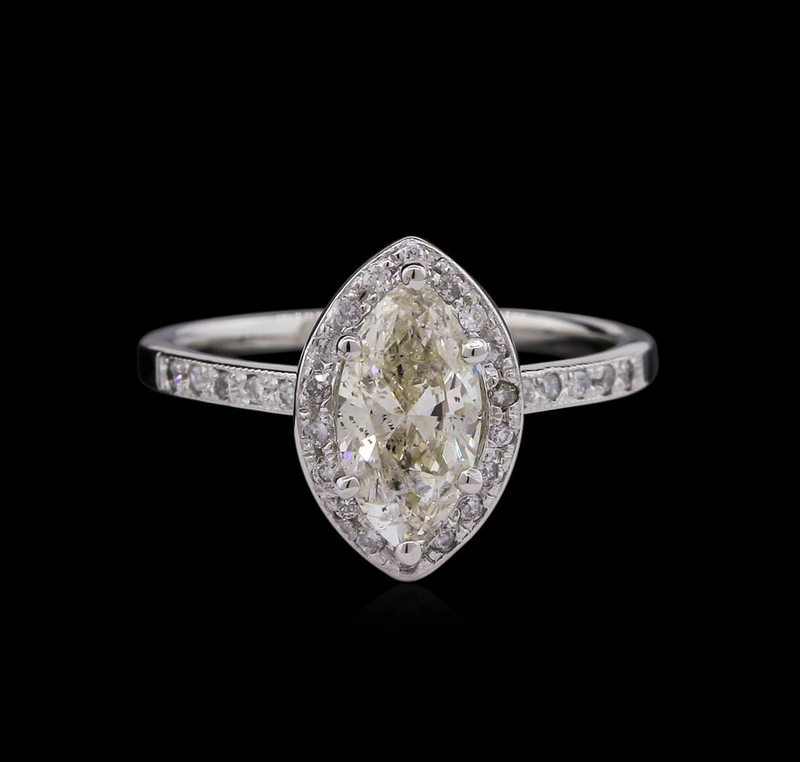 One electronically tested 14KT white gold lady's cast wedding ring with a halo with a bright polish finish. The featured lady's ring has a shank measuring 1.74 millimeters wide. Identified with markings of "14K". Condition is new, good workmanship. Containing: One prong set marquise shaped cut diamond, measuring 10.00 x 5.21 x 3.28mm (depth est.) approximate weight of 0.97ct. Graded in the setting. Clarity: I-1. Color: J - Very Good Twenty-Six prong set round brilliant cut diamonds, measuring 1.25 - 1.20 x 0.76mm (depth est.) approximate total weight of 26 Stones = 0.18ct. Graded in the setting. Clarity: SI-1 to I-1. Color: G - Good. Total Weight of Diamonds 1.15ct. Total Weight of Ring 3.30gm. GAS Appraised at $7,200.00.