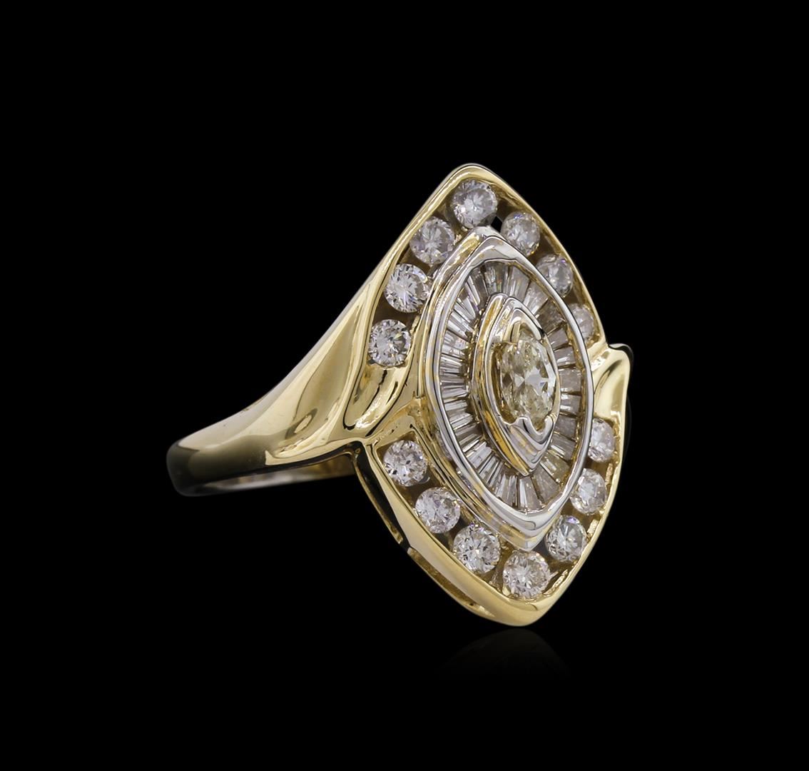 One electronically tested 14KT yellow gold lady's cast fashion ring with a bypass shank with a bright polish finish. The featured lady's ring has a shank measuring 2.38 millimeters wide. Identified with markings of "14K". Condition is new, good workmanship. Containing: One prong set marquise shaped cut diamond, measuring 5.00 x 2.74 x 1.73mm (depth est.) approximate weight of 0.14ct. Graded in the setting. Clarity: SI-1. Color: Very Good Fourteen channel set round brilliant cut diamonds, measuring 2.30 - 2.10 x 1.39mm (depth est.) approximate total weight of 14 Stones = 0.57ct. Graded in the setting. Clarity: SI-1 to SI-2. Color: H - I. Cut Good Twenty-Four channel set baguette cut (tapered) diamonds, measuring from 1.80 x 1.00 x 0.85mm (depth est.) to 2.10 x 1.20 x 1.02mm (depth est.) approximate total weight of 24 Stones = 0.44ct. Graded in the setting. Clarity: SI-1 to SI-2. Color: H - Good. Total Weight of Diamonds 1.15ct. Total Weight of Ring 6.80gm. GAS Appraised at $3,675.00.