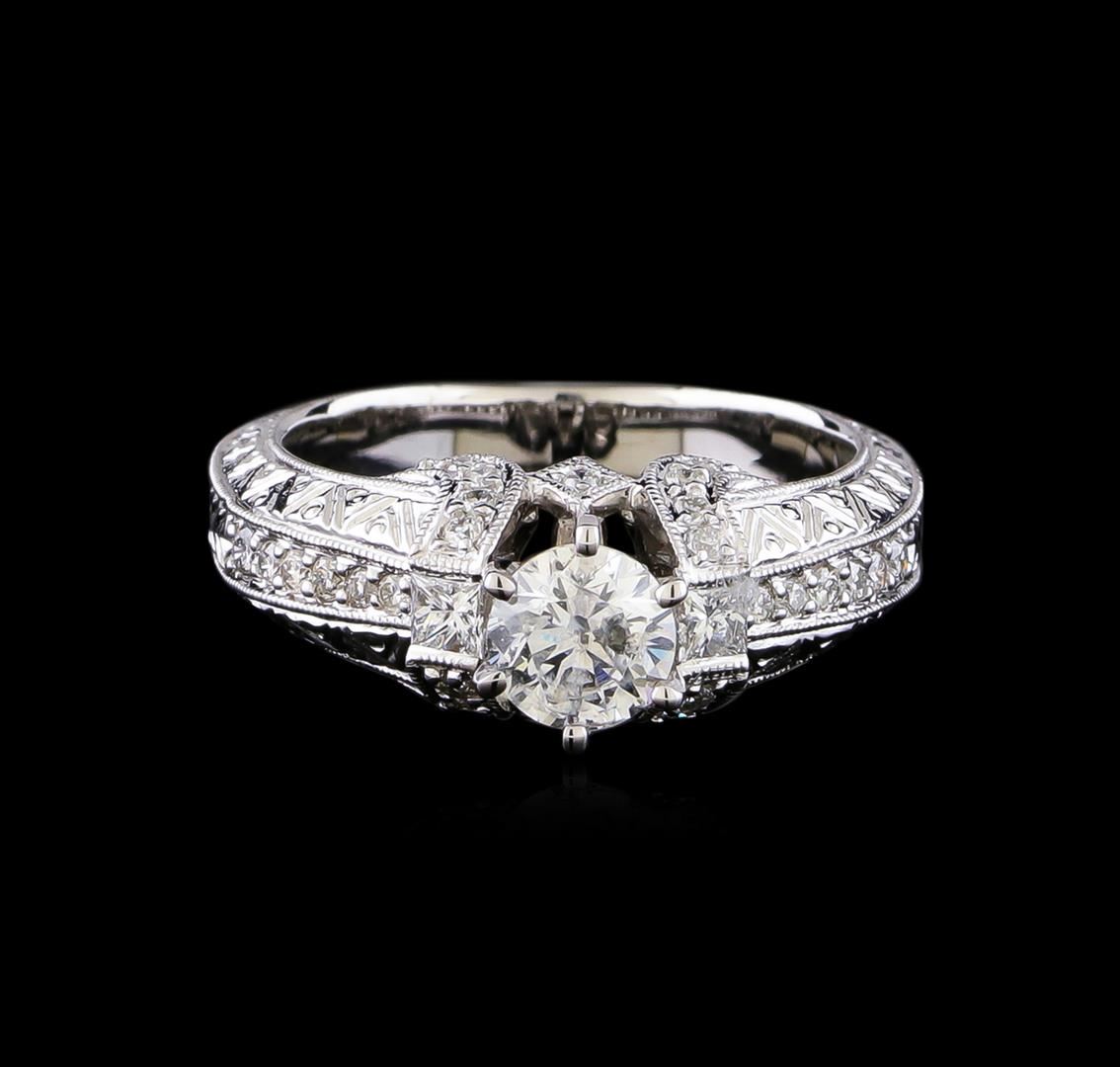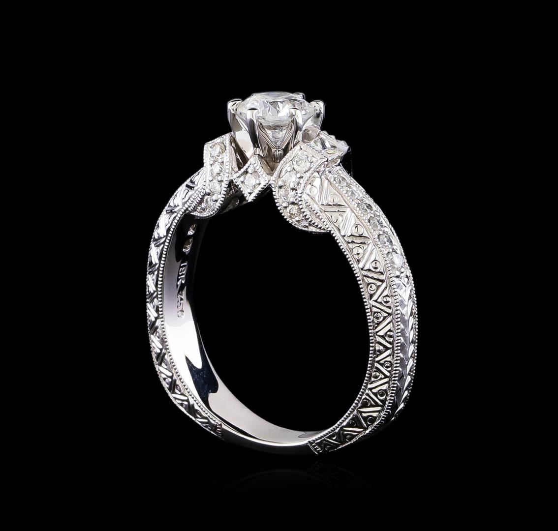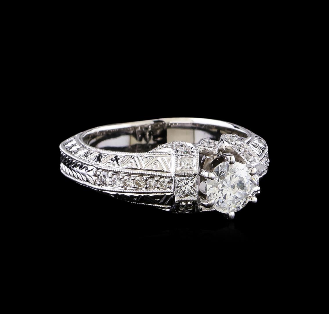 One electronically tested 18KT white gold ladies cast & assembled diamond unity ring. The featured diamond is set between mirroring stylized diamond ribbons supported by decorative diamond set tapering shoulders, completed by a four millimeter wide band. Bright and patterned finish with milgrain detailing. Identified with markings of "18K 750". Condition is good. Containing: One prong set round brilliant cut diamond, measuring 5.50 - 5.50 x 3.60mm (depth est.), 3.00.%. GTCF approximate weight of 0.70ct with a medium blue fluorescence. Clarity: I-2. Color: F. Depth 65.5%. Table 58.2%. Two channel set princess cut diamonds, measuring 2.30 x 2.20 x 1.65mm (depth est.) approximate total weight of 2 Stones = 0.15ct. Graded in the setting. Clarity: VS-2 to SI-1. Color: G - H Thirty prong set round brilliant cut diamonds, measuring 1.60 - 1.20 x 0.84mm (depth est.) approximate total weight of 30 Stones = 0.30ct. Graded in the setting. Clarity: SI-2 to I-1. Color: G - I. Total Weight of Diamonds 1.15ct. Total Weight of Ring 8.20gm. AIG Appraised at $7,335.00.