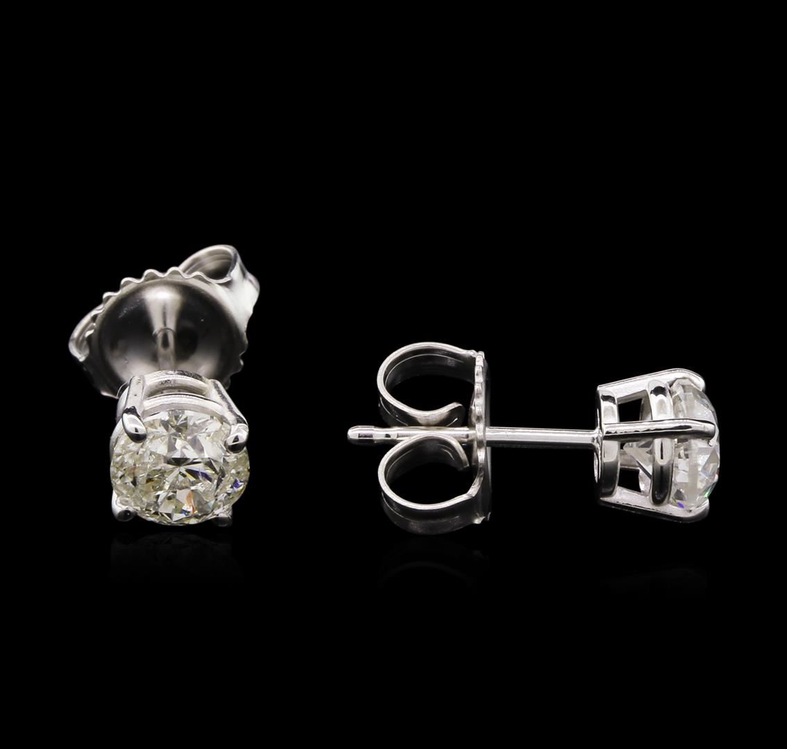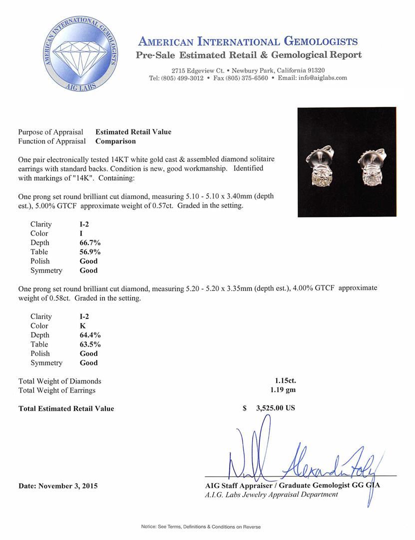 One pair electronically tested 14KT white gold cast & assembled diamond solitaire earrings with standard backs. Identified with markings of "14K". Condition is new, good workmanship. Containing: One prong set round brilliant cut diamond, measuring 5.10 - 5.10 x 3.40mm (depth est.), 5.00% GTCF approximate weight of 0.57ct. Graded in the setting. Clarity: I-2. Color: I. Depth 66.7%. Table 56.9%. One prong set round brilliant cut diamond, measuring 5.20 - 5.20 x 3.35mm (depth est.), 4.00% GTCF approximate weight of 0.58ct. Graded in the setting. Clarity: I-2. Color: K. Depth 64.4%. Table 63.5%. Total Weight of Diamonds 1.15ct. Total Weight of Earrings 1.19gm. AIG Appraised at $3,525.00.