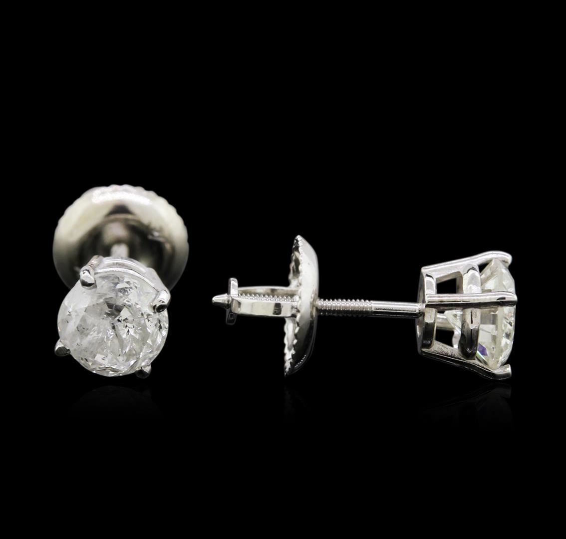 One pair electronically tested 14KT white gold lady's combination cast & assembled 4-prong stud earrings with threaded posts and screw-on/screw-off backs with a basket setting with a bright polish finish. Identified with markings of "14K". Condition is new, good workmanship. Containing: Two prong set round brilliant cut diamonds, measuring 5.23 - 5.10 x 3.46mm (depth est.) approximate total weight of 2 Stones = 1.15ct. Graded in the setting. Clarity: I-1 to I-2. Color: H - I. Cut Good. Total Weight of Diamonds 1.15ct. Total Weight of Earrings 1.10gm. GAS Appraised.