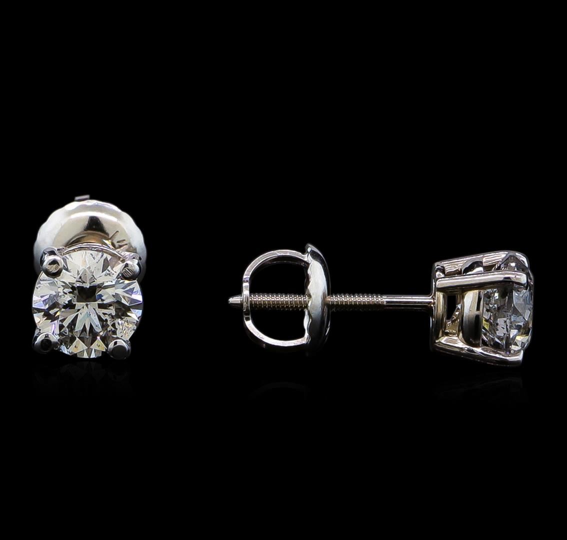 One pair electronically tested 14KT white gold lady's combination cast & assembled diamond stud earrings with threaded posts and screw-on/screw-off backs with a basket setting with a bright polish finish. Identified with markings of "14K". Condition is new, good workmanship. Containing: One prong set round brilliant cut diamond, measuring 5.15 - 5.12 x 3.55mm (depth est.) , 3.00.%. GTCF approximate weight of 0.59ct. Graded in the setting. Clarity: SI-3. Color: Good One prong set round brilliant cut diamond, measuring 5.10 - 5.07 x 3.42mm (depth est.) , 3.00.%. GTCF approximate weight of 0.56ct. Graded in the setting. Clarity: SI-2. Color: Very Good. Total Weight of Diamonds 1.15ct. Total Weight of Stud Earrings 1.20gm. GAS Appraised at $7,120.00.