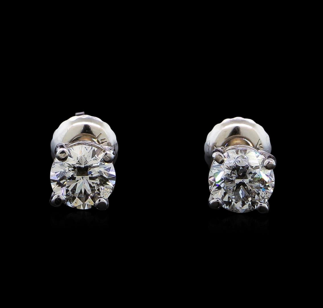 One pair electronically tested 14KT white gold lady's combination cast & assembled diamond stud earrings with threaded posts and screw-on/screw-off backs with a basket setting with a bright polish finish. Identified with markings of "14K". Condition is new, good workmanship. Containing: One prong set round brilliant cut diamond, measuring 5.15 - 5.12 x 3.55mm (depth est.) , 3.00.%. GTCF approximate weight of 0.59ct. Graded in the setting. Clarity: SI-3. Color: Good One prong set round brilliant cut diamond, measuring 5.10 - 5.07 x 3.42mm (depth est.) , 3.00.%. GTCF approximate weight of 0.56ct. Graded in the setting. Clarity: SI-2. Color: Very Good. Total Weight of Diamonds 1.15ct. Total Weight of Stud Earrings 1.20gm. GAS Appraised at $7,120.00.