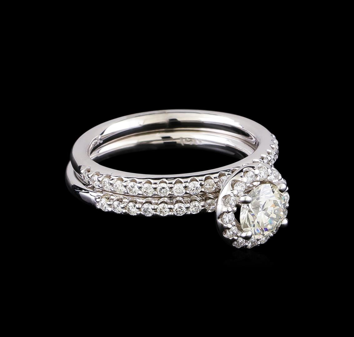 One electronically tested 14KT white gold lady's cast wedding set rings with a halo with a bright polish finish. The featured lady's ring set has a double shank measuring 3.90 millimeters in width. Identified with markings of "14K". Condition is new, good workmanship. Containing: One prong set round brilliant cut diamond, measuring 5.68 - 5.59 x 3.81mm (depth est.) approximate weight of 0.67ct. Graded in the setting. Clarity: SI-1. Color: I. Cut Very Good Forty-Nine prong set round brilliant cut diamonds, measuring 1.40 - 1.30 x 0.84mm (depth est.) approximate total weight of 49 Stones = 0.48ct. Graded in the setting. Clarity: VS-2 to SI-2. Color: G - Good. Total Weight of Diamonds 1.15ct. Total Weight of Rings 5.70gm GAS Appraised at $6,445.00.