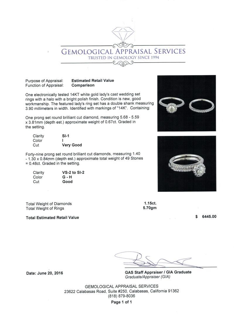 One electronically tested 14KT white gold lady's cast wedding set rings with a halo with a bright polish finish. The featured lady's ring set has a double shank measuring 3.90 millimeters in width. Identified with markings of "14K". Condition is new, good workmanship. Containing: One prong set round brilliant cut diamond, measuring 5.68 - 5.59 x 3.81mm (depth est.) approximate weight of 0.67ct. Graded in the setting. Clarity: SI-1. Color: I. Cut Very Good Forty-Nine prong set round brilliant cut diamonds, measuring 1.40 - 1.30 x 0.84mm (depth est.) approximate total weight of 49 Stones = 0.48ct. Graded in the setting. Clarity: VS-2 to SI-2. Color: G - Good. Total Weight of Diamonds 1.15ct. Total Weight of Rings 5.70gm GAS Appraised at $6,445.00.