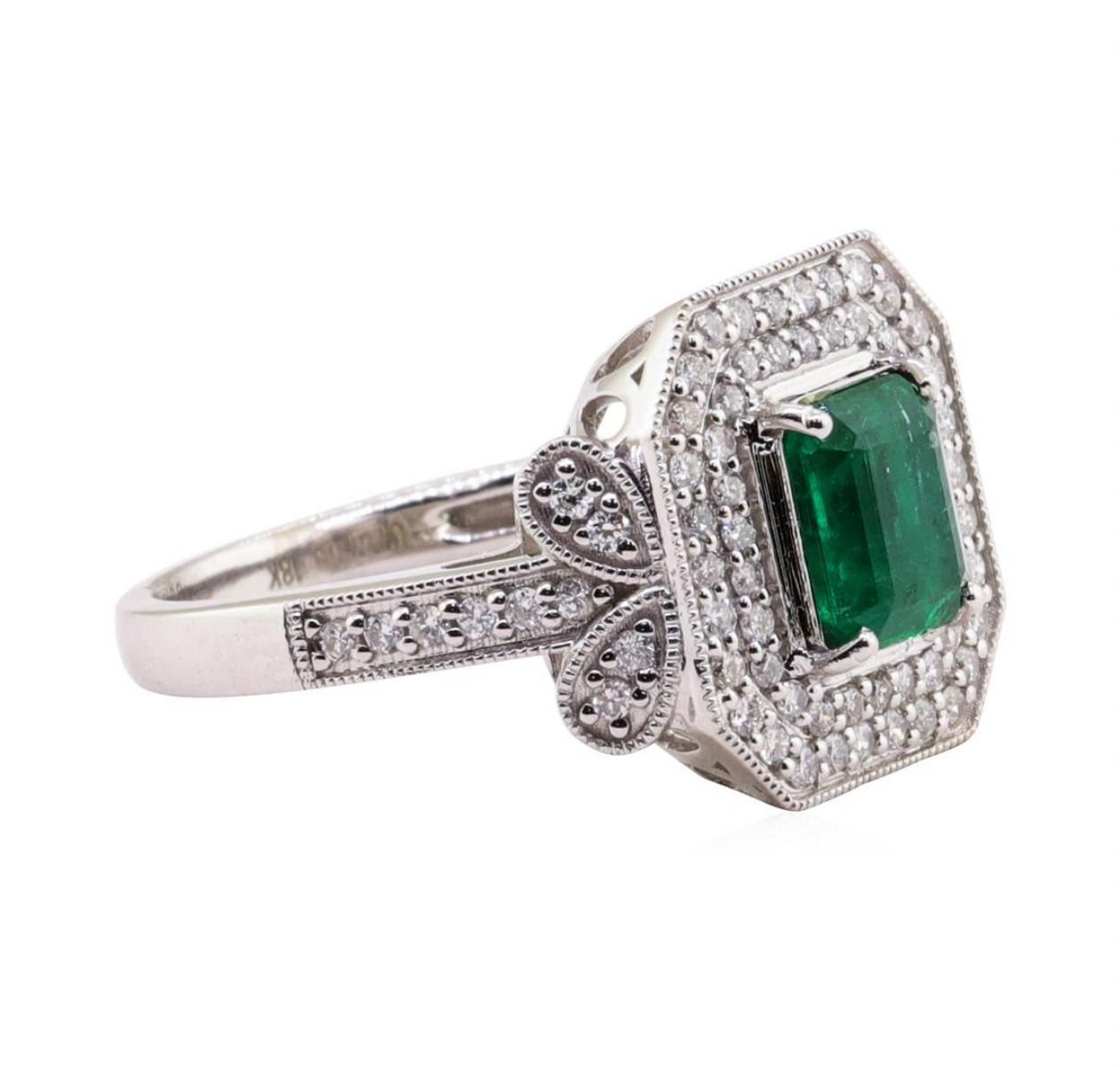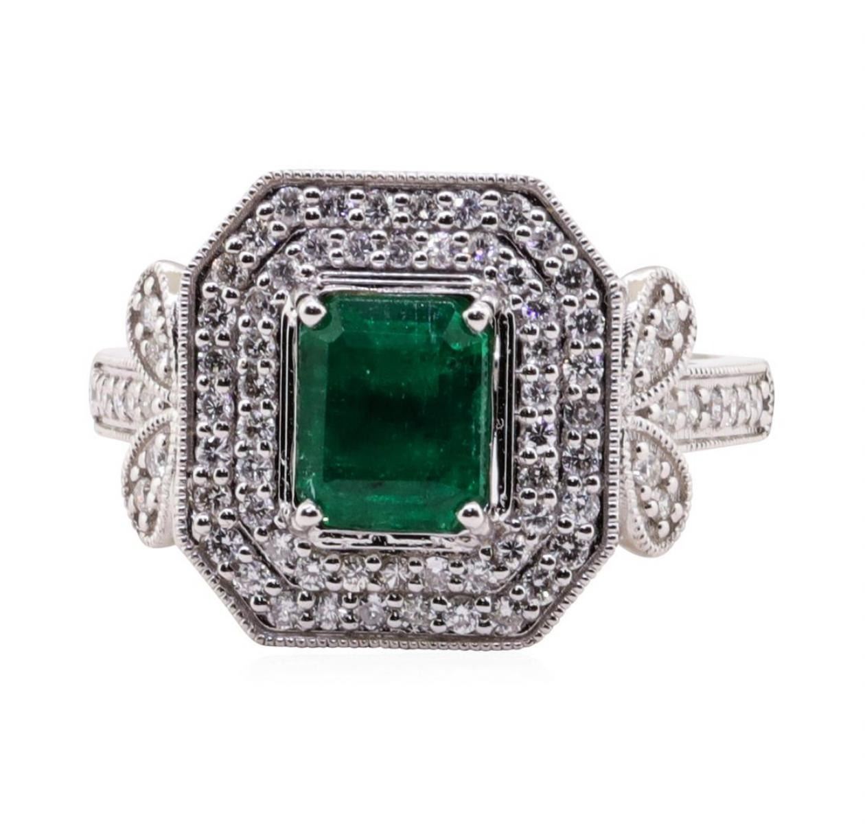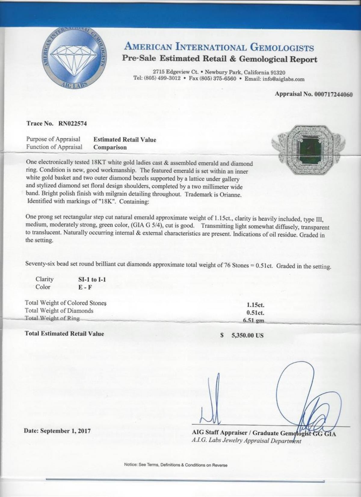 One 1.15ct Emerald and Diamond Ring - 18KT White Gold. AIG certified. See Appraisal for more details. AIG Appraised.