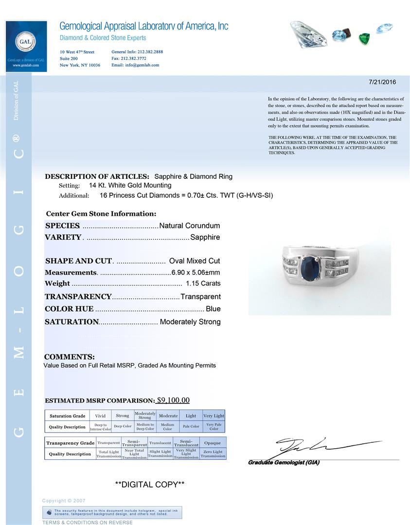 One Sapphire and Diamond Ring. Setting: 14 Kt. White Gold Mounting. Additional: 16 Princess Cut Diamonds = 0.70 Cts. TWT (G-H/VS-SI). Center Gem Stone Information: Species: Natural Corundum. Variety: Sapphire. Shape and Cut: Oval Mixed Cut. Measurements: 6.90 x 5.06 mm. Weight: 1.15 Carats. Transparency: Transparent. Color Hue: Blue. Saturation: Moderately Strong. Total Weight: 10.57 grams.