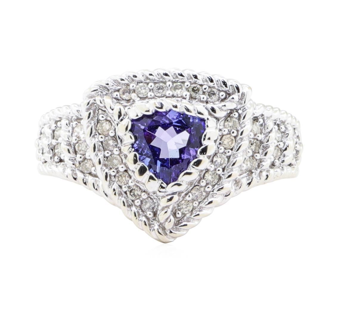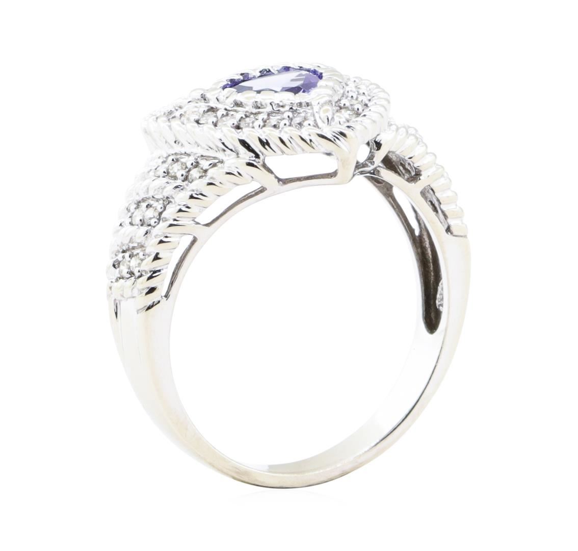 One electronically tested 14KT white gold lady's cast fashion halo ring with a tapered shank with a bright polish finish. The featured lady's ring has twisted wire accents and a shank measuring 2.85 millimeters in width. Identified with markings of '14K'. Condition is new, good workmanship. Containing: One bezel set triangle modified brilliant cut natural tanzanite, measuring 6.75 x 6.60 x 3.12mm, (depth est.) approximate weight of 0.85ct., clarity is eye clean, medium, moderately strong, violetish blue color, (GIA vB 5/4), cut is very good. Colored gemstones are presumed to have been subjected to commonly used enhancement processes. Transmitting light with no distortion, transparent. Graded in the setting. Thirty-Two prong set round brilliant cut diamonds, measuring 1.35 - 1.30 x 0.82mm (depth est.) approximate total weight of 32 Stones = 0.30 ct. Graded in the setting. Color H - J Clarity SI-1 to SI-2 Cut Very Good. Total Weight of Colored Stones 0.85ct.. Total Weight of Diamonds 0.30 ct.. Total Weight of Ring 5.60gm GAS Appraised at $3200.00. GAS Appraised.