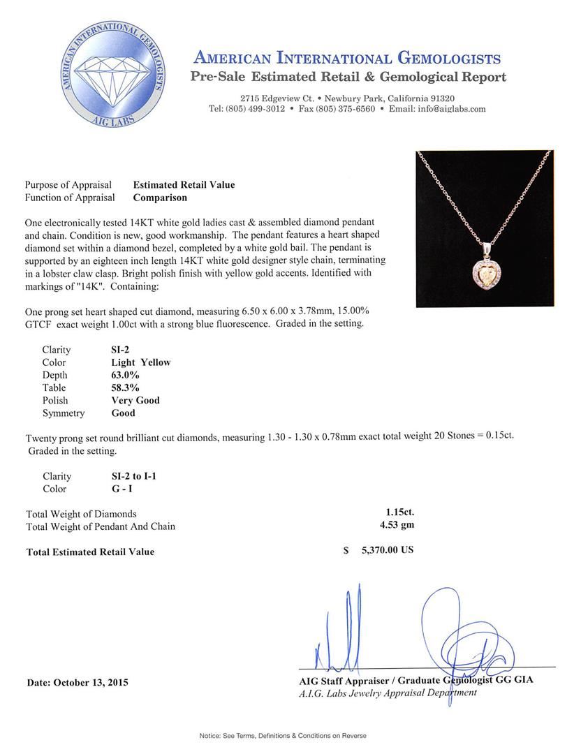 One electronically tested 14KT white gold ladies cast & assembled diamond pendant and chain. The pendant features a heart shaped diamond set within a diamond bezel, completed by a white gold bail. The pendant is supported by an eighteen inch length 14KT white gold designer style chain, terminating in a lobster claw clasp. Bright polish finish with yellow gold accents. Identified with markings of "14K". Condition is new, good workmanship. Containing: One prong set heart shaped cut diamond, measuring 6.50 x 6.00 x 3.78mm, 15.00% GTCF exact weight 1.00ct with a strong blue fluorescence. Graded in the setting. Clarity: SI-2. Depth: 63.0%. Table 58.3%. Twenty prong set round brilliant cut diamonds, measuring 1.30 - 1.30 x 0.78mm exact total weight 20 Stones = 0.15ct. Graded in the setting. Clarity: SI-2 to I-1. Color: G - I. Total Weight of Diamonds 1.15ct. Total Weight of Pendant And Chain 4.53gm. AIG Appraised at $5,370.00.