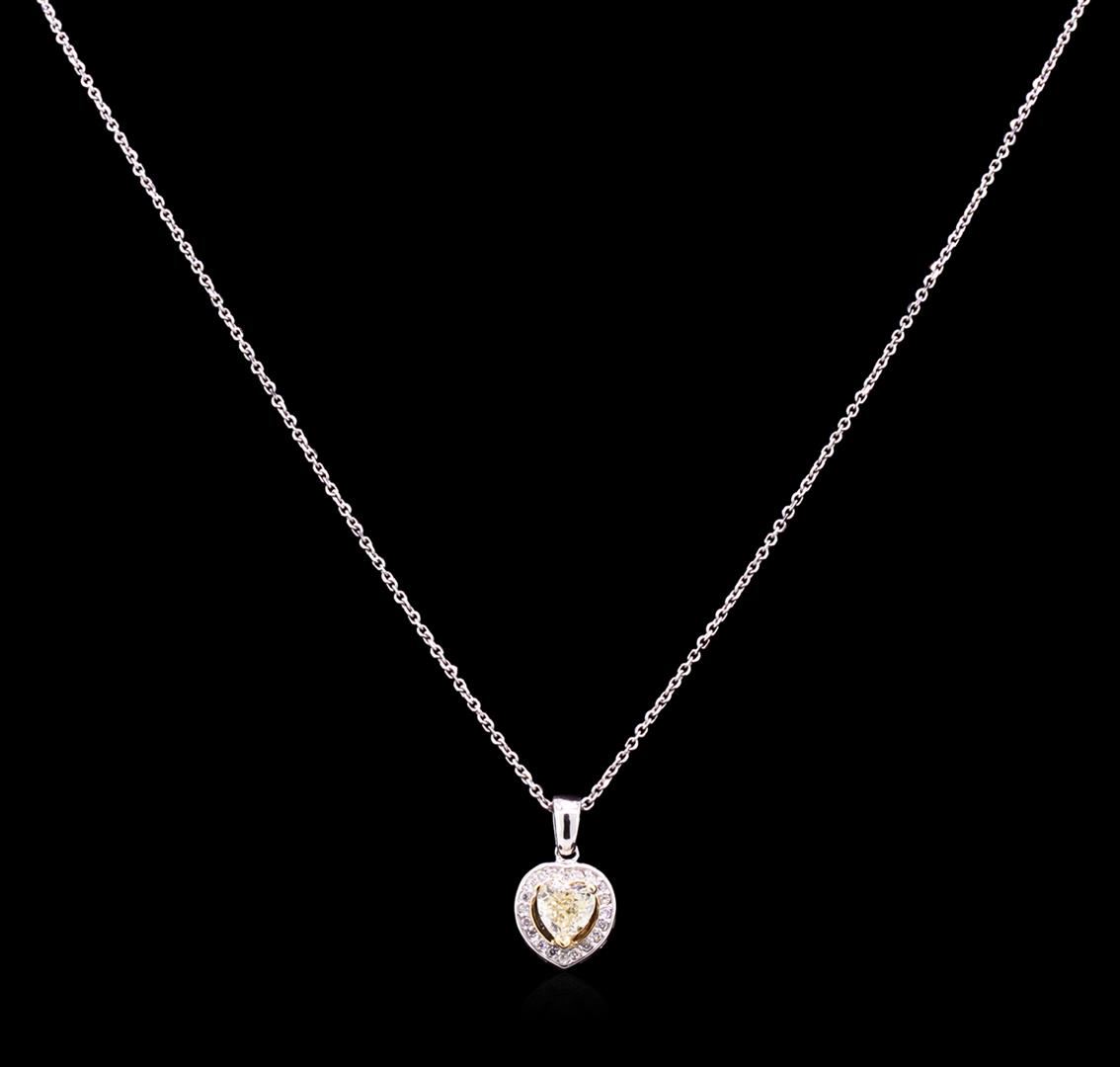 One electronically tested 14KT white gold ladies cast & assembled diamond pendant and chain. The pendant features a heart shaped diamond set within a diamond bezel, completed by a white gold bail. The pendant is supported by an eighteen inch length 14KT white gold designer style chain, terminating in a lobster claw clasp. Bright polish finish with yellow gold accents. Identified with markings of "14K". Condition is new, good workmanship. Containing: One prong set heart shaped cut diamond, measuring 6.50 x 6.00 x 3.78mm, 15.00% GTCF exact weight 1.00ct with a strong blue fluorescence. Graded in the setting. Clarity: SI-2. Depth: 63.0%. Table 58.3%. Twenty prong set round brilliant cut diamonds, measuring 1.30 - 1.30 x 0.78mm exact total weight 20 Stones = 0.15ct. Graded in the setting. Clarity: SI-2 to I-1. Color: G - I. Total Weight of Diamonds 1.15ct. Total Weight of Pendant And Chain 4.53gm. AIG Appraised at $5,370.00.