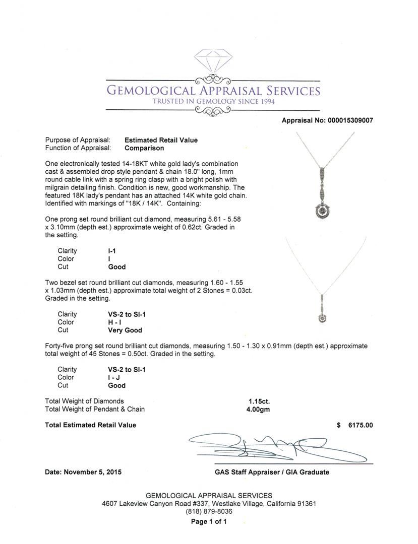 One electronically tested 14-18KT white gold lady's combination cast & assembled drop style pendant & chain 18.0" long, 1mm round cable link with a spring ring clasp with a bright polish with milgrain detailing finish. The featured 18K lady's pendant has an attached 14K white gold chain. Identified with markings of "18K / 14K". Condition is new, good workmanship. Containing: One prong set round brilliant cut diamond, measuring 5.61 - 5.58 x 3.10mm (depth est.) approximate weight of 0.62ct. Graded in the setting. Clarity: I-1. Color: I. Cut Good Two bezel set round brilliant cut diamonds, measuring 1.60 - 1.55 x 1.03mm (depth est.) approximate total weight of 2 Stones = 0.03ct. Graded in the setting. Clarity: VS-2 to SI-1. Color: H - I. Cut Very Good Forty-Five prong set round brilliant cut diamonds, measuring 1.50 - 1.30 x 0.91mm (depth est.) approximate total weight of 45 Stones = 0.50ct. Graded in the setting. Clarity: VS-2 to SI-1. Color: I - Good. Total Weight of Diamonds 1.15ct. Total Weight of Pendant & Chain 4.00gm GAS Appraised at $6,175.00.