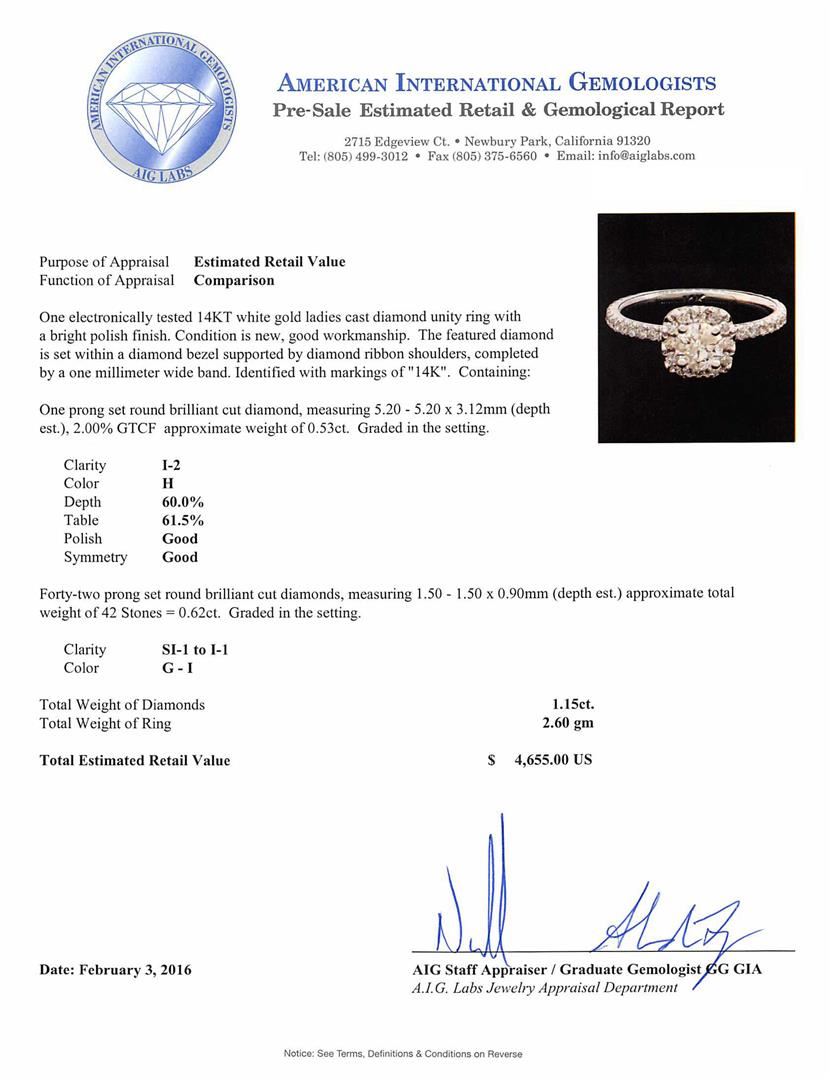 One electronically tested 14KT white gold ladies cast diamond unity ring with a bright polish finish. The featured diamond is set within a diamond bezel supported by diamond ribbon shoulders, completed by a one millimeter wide band. Identified with markings of "14K". Condition is new, good workmanship. Containing: One prong set round brilliant cut diamond, measuring 5.20 - 5.20 x 3.12mm (depth est.), 2.00.%. GTCF approximate weight of 0.53ct. Graded in the setting. Clarity: I-2. Color: 60.0%. Table 61.5%. Forty-Two prong set round brilliant cut diamonds, measuring 1.50 - 1.50 x 0.90mm (depth est.) approximate total weight of 42 Stones = 0.62ct. Graded in the setting. Clarity: SI-1 to I-1. Color: G - I. Total Weight of Diamonds 1.15ct. Total Weight of Ring 2.60gm. AIG Appraised at $4,655.00.