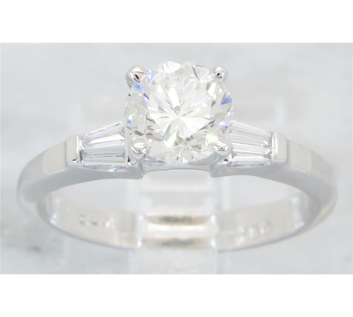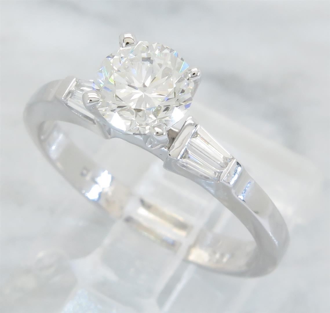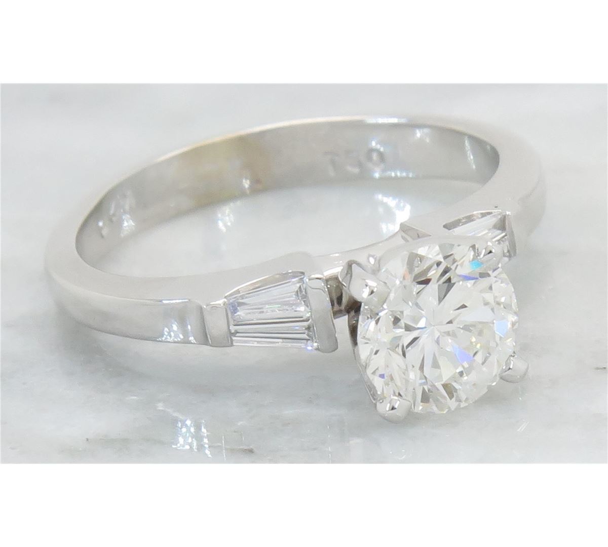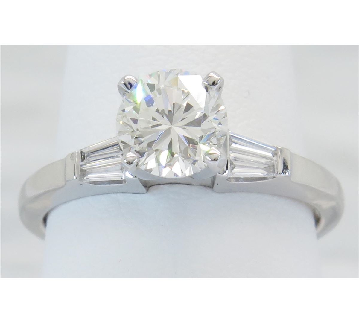 One tested 18K white gold diamond ring. Containing: One Round Brilliant Cut Diamond. Approximate Size: 1.00CT, Clarity: VS2, Color: I. Four Baguette Cut Diamonds. Approximate total diamond weight: 1.15CTW. Diamonds are graded in the mounting, unless otherwise stated. Weight: 3.4 grams, Size: 4.75.