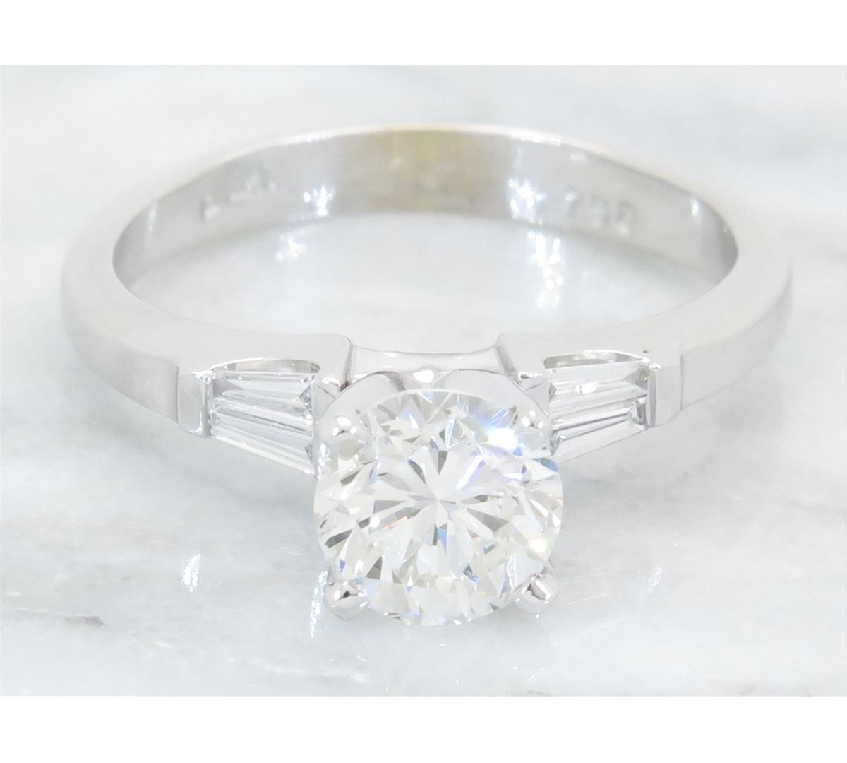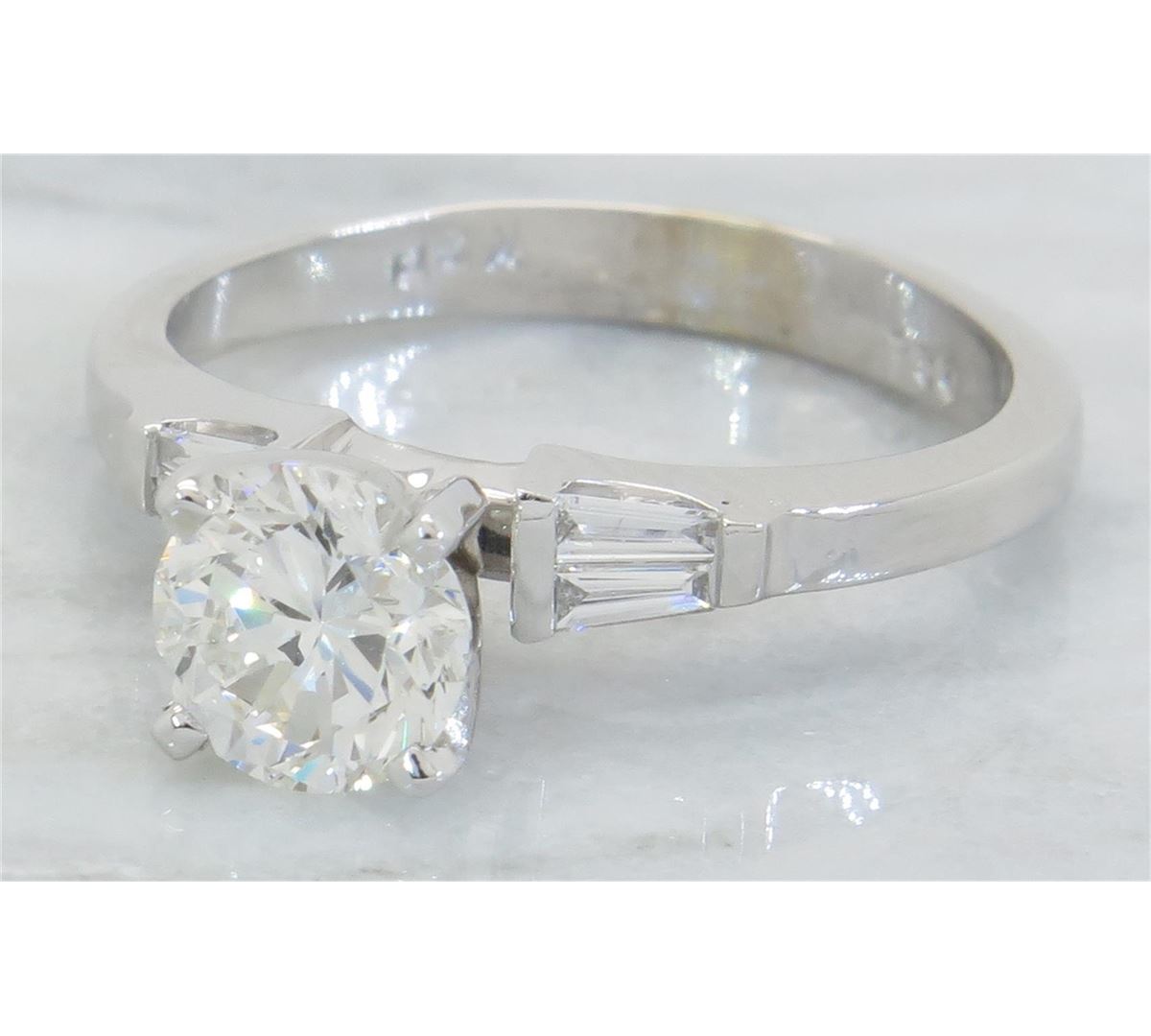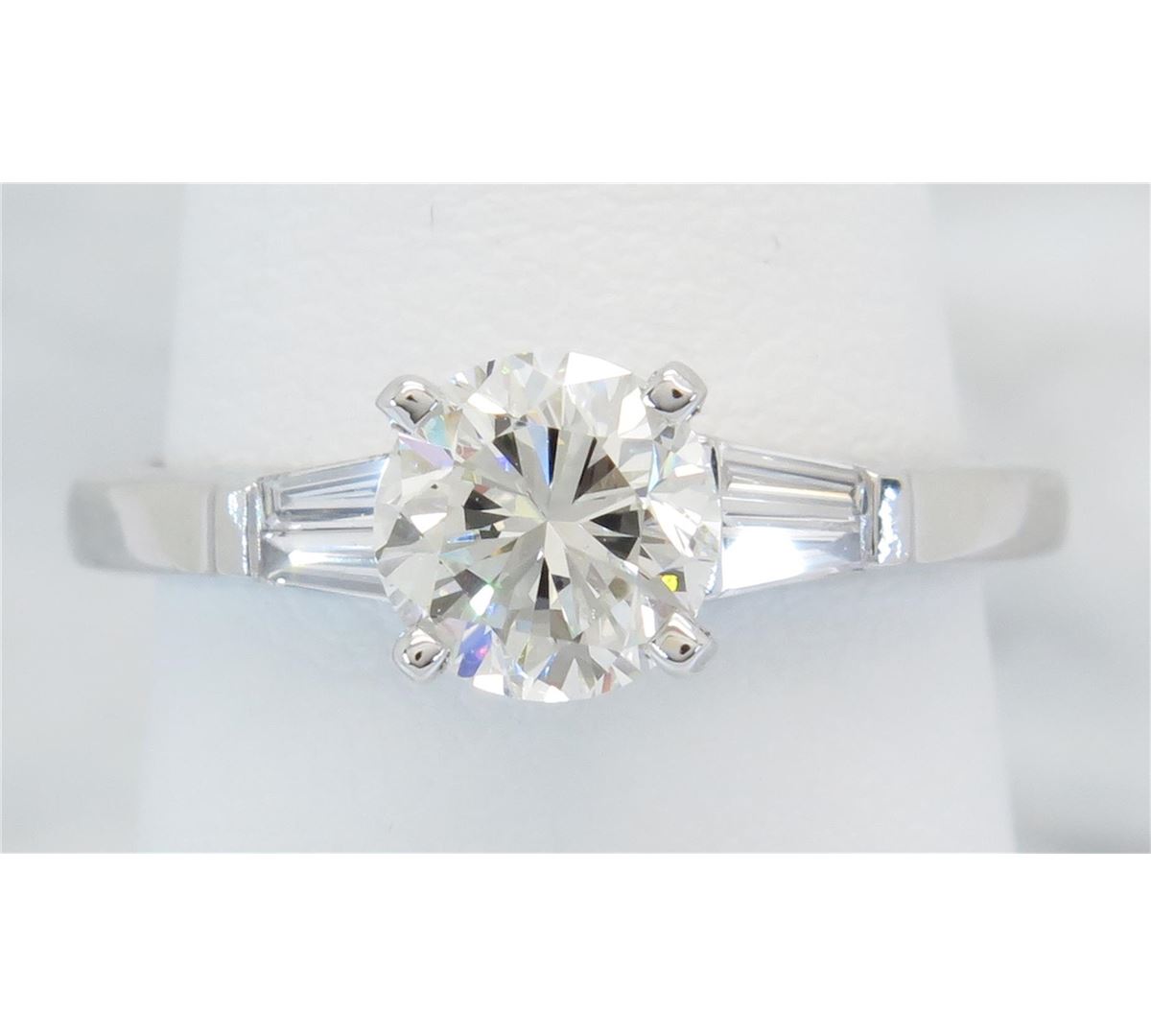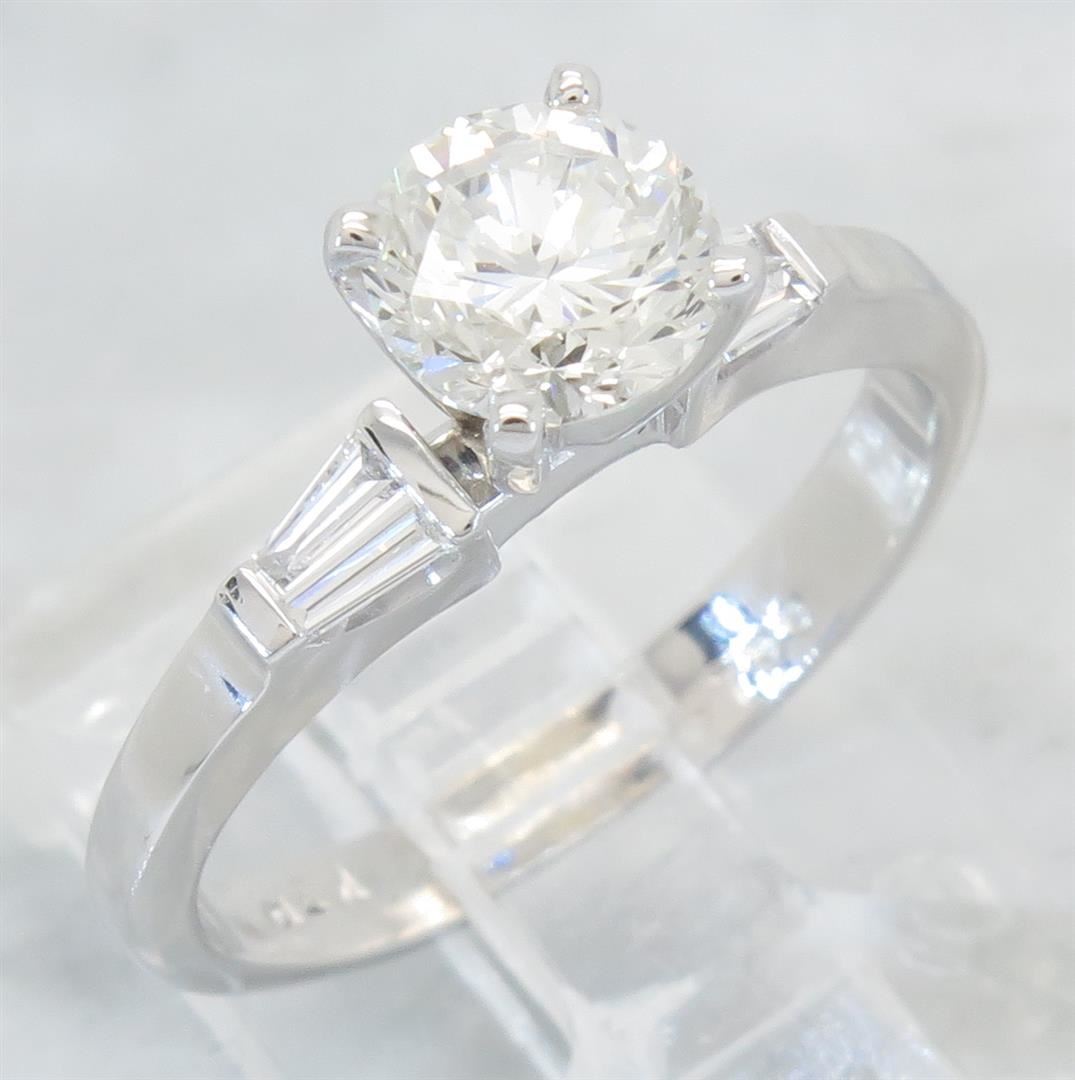 One tested 18K white gold diamond ring. Containing: One Round Brilliant Cut Diamond. Approximate Size: 1.00CT, Clarity: VS2, Color: I. Four Baguette Cut Diamonds. Approximate total diamond weight: 1.15CTW. Diamonds are graded in the mounting, unless otherwise stated. Weight: 3.4 grams, Size: 4.75.