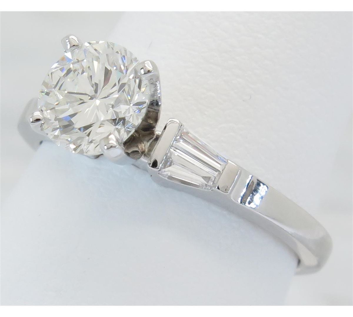 One tested 18K white gold diamond ring. Containing: One Round Brilliant Cut Diamond. Approximate Size: 1.00CT, Clarity: VS2, Color: I. Four Baguette Cut Diamonds. Approximate total diamond weight: 1.15CTW. Diamonds are graded in the mounting, unless otherwise stated. Weight: 3.4 grams, Size: 4.75.