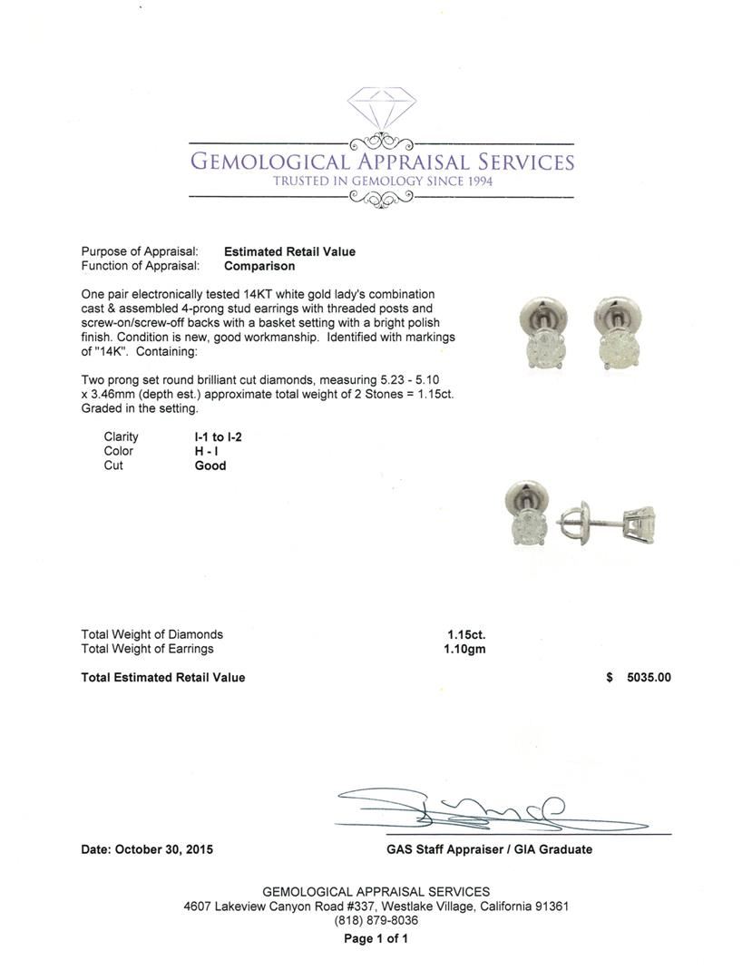 One pair electronically tested 14KT white gold lady's combination cast & assembled 4-prong stud earrings with threaded posts and screw-on/screw-off backs with a basket setting with a bright polish finish. Identified with markings of "14K". Condition is new, good workmanship. Containing: Two prong set round brilliant cut diamonds, measuring 5.23 - 5.10 x 3.46mm (depth est.) approximate total weight of 2 Stones = 1.15ct. Graded in the setting. Clarity: I-1 to I-2. Color: H - I. Cut Good. Total Weight of Diamonds 1.15ct. Total Weight of Earrings 1.10gm. GAS Appraised.