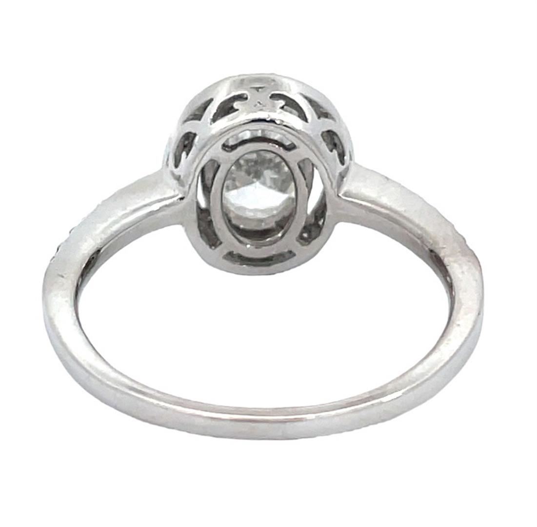 One electronically tested 14KT white gold lady's cast oval halo wedding ring with a cathedral basket motif with a bright polish finish. The featured lady's ring has a shank measuring 1.50 millimeters wide. Identified with markings of "14K". Condition is new, good workmanship.Containing: One prong set oval shaped cut diamond, measuring 7.70 x 5.48 x 3.48mm (depth est.), 5.00% GTCF approximate weight of 1.00ct. Graded in the setting.Color H - IClarity SI-3 Cut Very Good Thirty-Six prong set round brilliant cut diamonds, measuring 1.10 - 1.05 x 0.65mm (depth est.) approximate total weight of 36 Stones = 0.16ct. Graded in the setting.Color H - IClarity VS-2 to SI-2Cut Good Total Weight of Diamonds 1.16ct. Total Weight of Wedding Ring 3.00gm