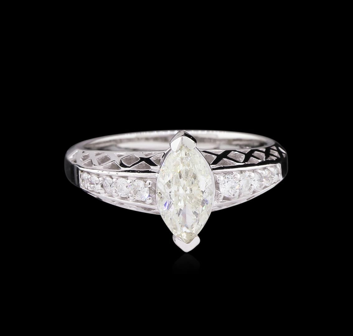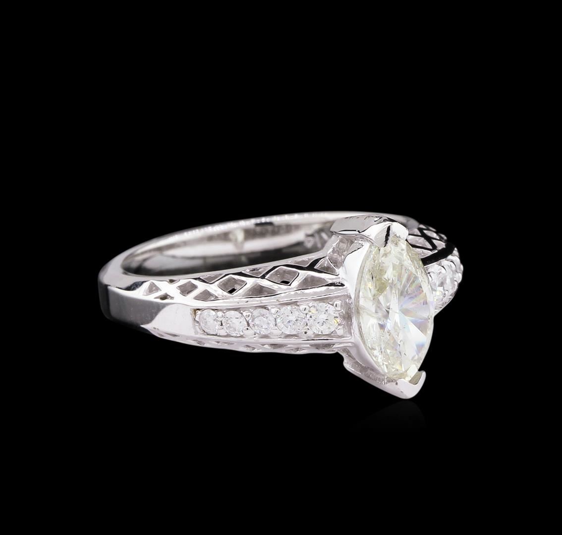 One electronically tested 14KT white gold lady's cast wedding ring with a half round shank with a bright polish finish. The featured lady's ring has a shank measuring 2.85 millimeters wide. Identified with markings of "K14". Condition is new, good workmanship. Containing: One prong set marquise shaped cut diamond, measuring 8.95 x 5.02 x 3.05mm (depth est.) , 15.00% GTCF approximate weight of 0.96ct. Graded in the setting. Clarity: I-1. Color: H - I. Cut Very Good Four prong set round brilliant cut diamonds, measuring 2.00 - 1.90 x 1.25mm (depth est.) approximate total weight of 4 Stones = 0.12ct. Graded in the setting. Clarity: SI-1 to SI-2. Color: G - Good Six prong set round brilliant cut diamonds, measuring 1.55 - 1.45 x 0.95mm (depth est.) approximate total weight of 6 Stones = 0.08ct. Graded in the setting. Clarity: SI-1 to I-1. Color: G - Good. Total Weight of Diamonds 1.16ct. Total Weight of Ring 4.30gm. GAS Appraised at $7,190.00.