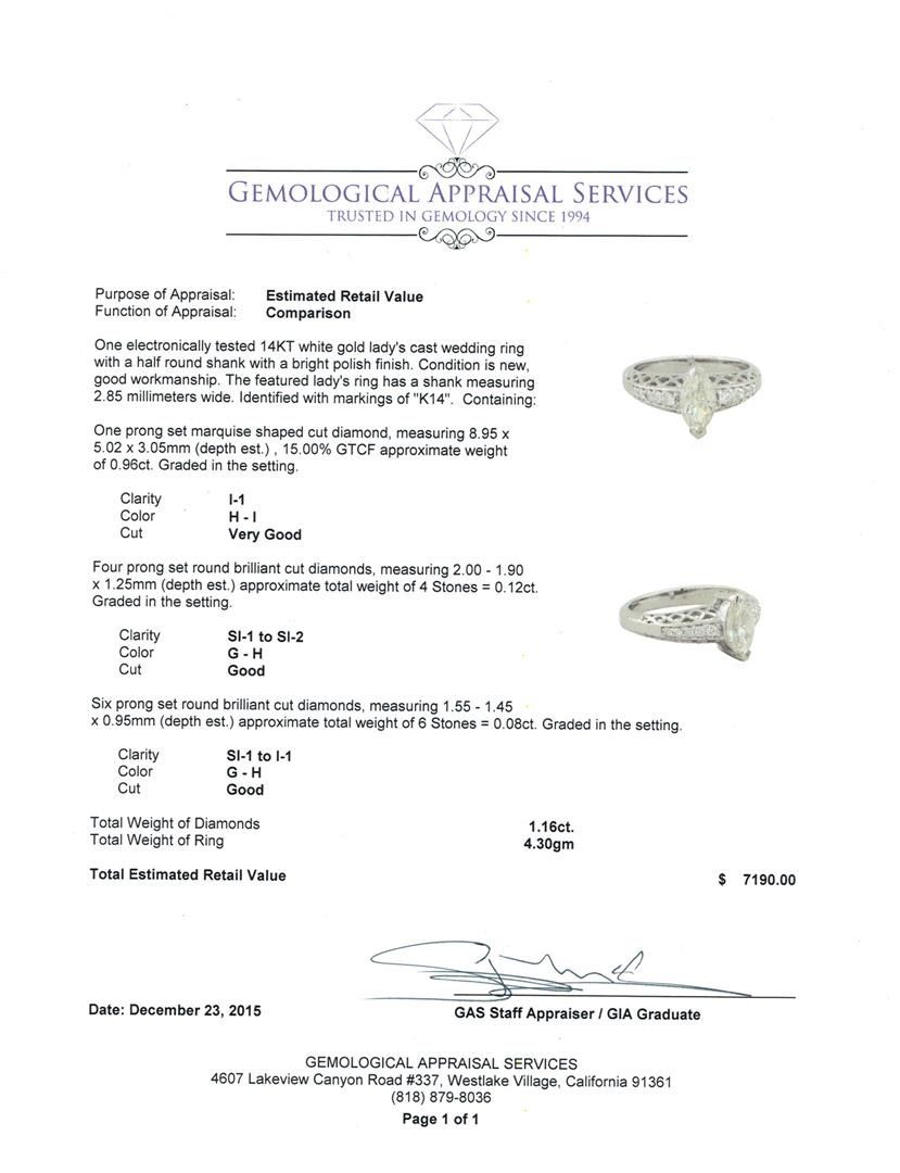 One electronically tested 14KT white gold lady's cast wedding ring with a half round shank with a bright polish finish. The featured lady's ring has a shank measuring 2.85 millimeters wide. Identified with markings of "K14". Condition is new, good workmanship. Containing: One prong set marquise shaped cut diamond, measuring 8.95 x 5.02 x 3.05mm (depth est.) , 15.00% GTCF approximate weight of 0.96ct. Graded in the setting. Clarity: I-1. Color: H - I. Cut Very Good Four prong set round brilliant cut diamonds, measuring 2.00 - 1.90 x 1.25mm (depth est.) approximate total weight of 4 Stones = 0.12ct. Graded in the setting. Clarity: SI-1 to SI-2. Color: G - Good Six prong set round brilliant cut diamonds, measuring 1.55 - 1.45 x 0.95mm (depth est.) approximate total weight of 6 Stones = 0.08ct. Graded in the setting. Clarity: SI-1 to I-1. Color: G - Good. Total Weight of Diamonds 1.16ct. Total Weight of Ring 4.30gm. GAS Appraised at $7,190.00.