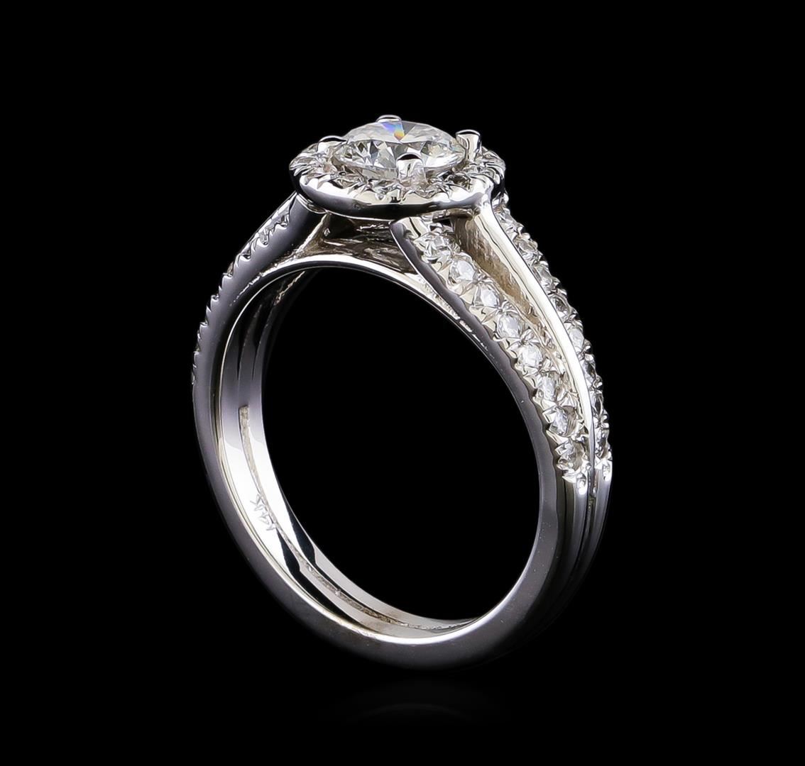One electronically tested 14KT white gold lady's cast wedding ring with a split shank cathedral halo with a bright polish finish. The featured lady's ring has a double shank measuring 3.0 millimeters in width. Identified with markings of "14K". Condition is new, good workmanship. Containing: One prong set round brilliant cut diamond, measuring 5.48 - 5.48 x 3.28mm (depth est.) approximate weight of 0.62ct. Graded in the setting. Clarity: SI-2. Color: H - I. Cut Good Forty-Six prong set round brilliant cut diamonds, measuring 1.50 - 1.40 x 0.90mm (depth est.) approximate total weight of 46 Stones = 0.54ct. Graded in the setting. Clarity: SI-1 to SI-2. Color: G - Good. Total Weight of Diamonds 1.16ct. Total Weight of Ring 4.90gm. GAS Appraised at $6,575.00.