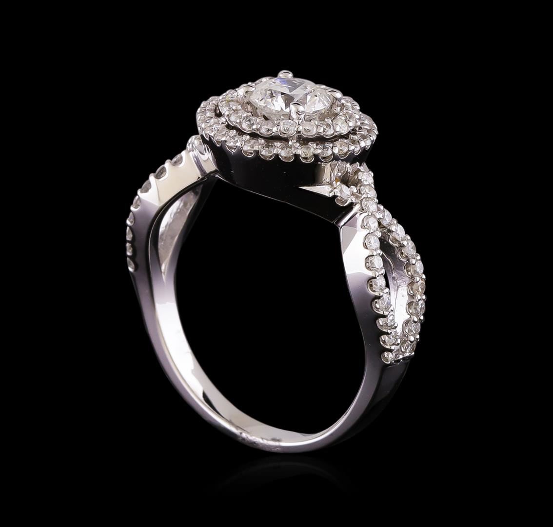 One electronically tested 14KT white gold lady's cast wedding ring with a split shank double halo with a bright polish finish. The featured lady's ring has a shank measuring 2.45 millimeters wide. Identified with markings of "K14". Condition is new, good workmanship. Containing: One prong set round brilliant cut diamond, measuring 5.13 - 5.12 x 3.24mm (depth est.) , 5.00.%. GTCF approximate weight of 0.55ct. Graded in the setting. Clarity: I-1. Color: G - Excellent Forty round brilliant cut diamonds, measuring 1.30 - 1.20 x 0.78mm (depth est.) approximate total weight of 40 Stones = 0.30ct. Graded in the setting. Clarity: SI-1 to SI-2. Color: G - Good Sixty-Four prong set round brilliant cut diamonds, measuring 1.15 - 1.05 x 0.67mm (depth est.) approximate total weight of 64 Stones = 0.31ct. Graded in the setting. Clarity: SI-1 to SI-2. Color: G - Good. Total Weight of Diamonds 1.16ct. Total Weight of Ring 4.40gm. GAS Appraised at $6,555.00.