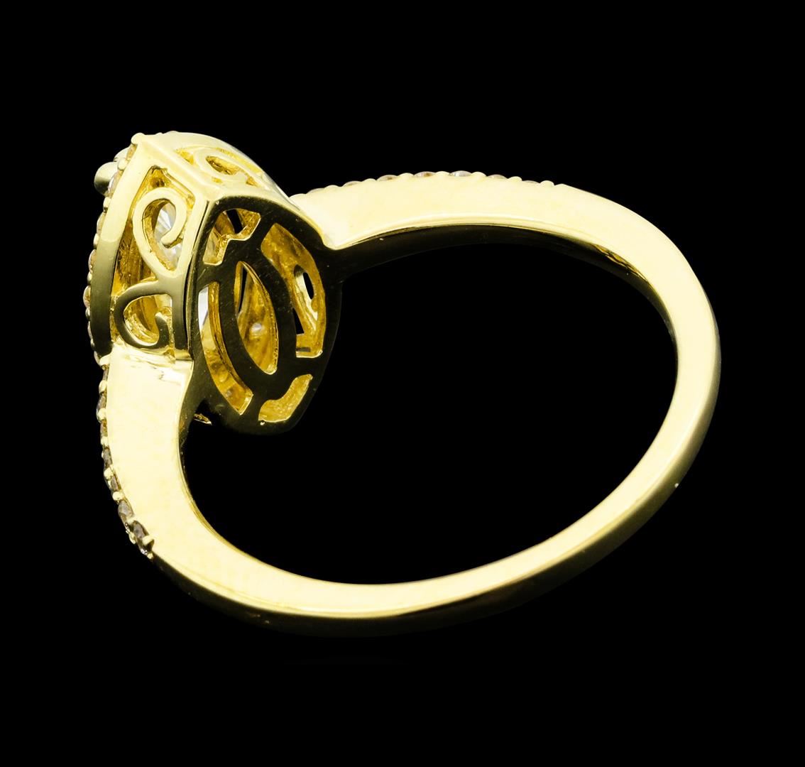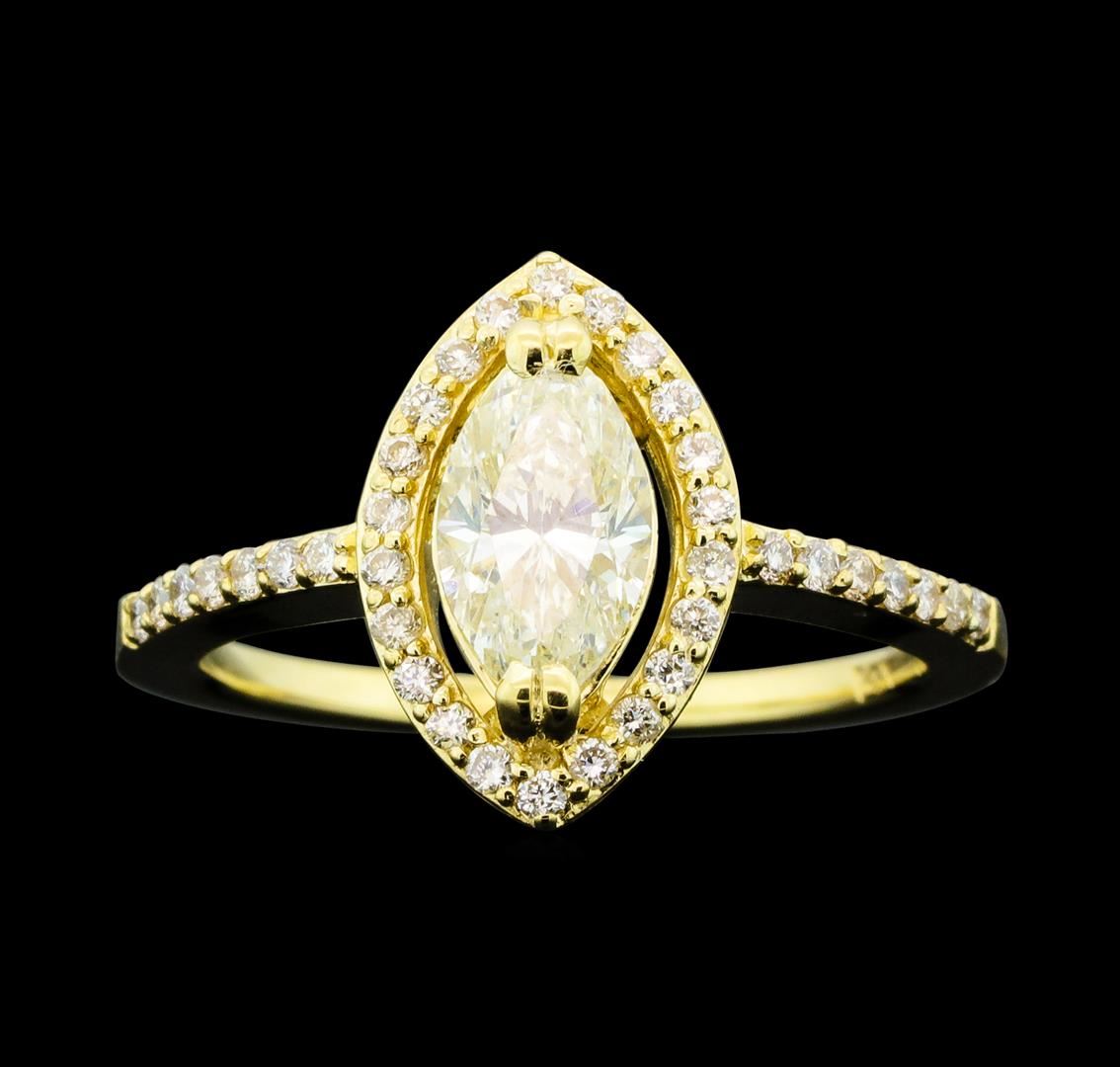 One electronically tested 14KT yellow gold lady's cast wedding ring with a basket halo with cathedral shank with a bright polish finish. The featured lady's ring has a shank measuring 1.32 millimeters wide. Identified with markings of '14K'. Condition is new, good workmanship. Containing: One prong set marquise shaped cut diamond, measuring 8.30 x 4.86 x 3.70mm (depth est.), 5.00.%. GTCF approximate weight of 0.91ct. Graded in the setting. Clarity SI-1. Color: K - L Cut Very Good Thirty-Six prong set round brilliant cut diamonds, measuring 1.25 - 1.15 x 0.74mm (depth est.) approximate total weight of 36 Stones = 0.25ct. Graded in the setting. Clarity SI-1 to SI-2. Color: H - I Cut Very Good. Total Weight of Diamonds 1.16ct.. Total Weight of Ring 3.00gm. GAS Appraised.