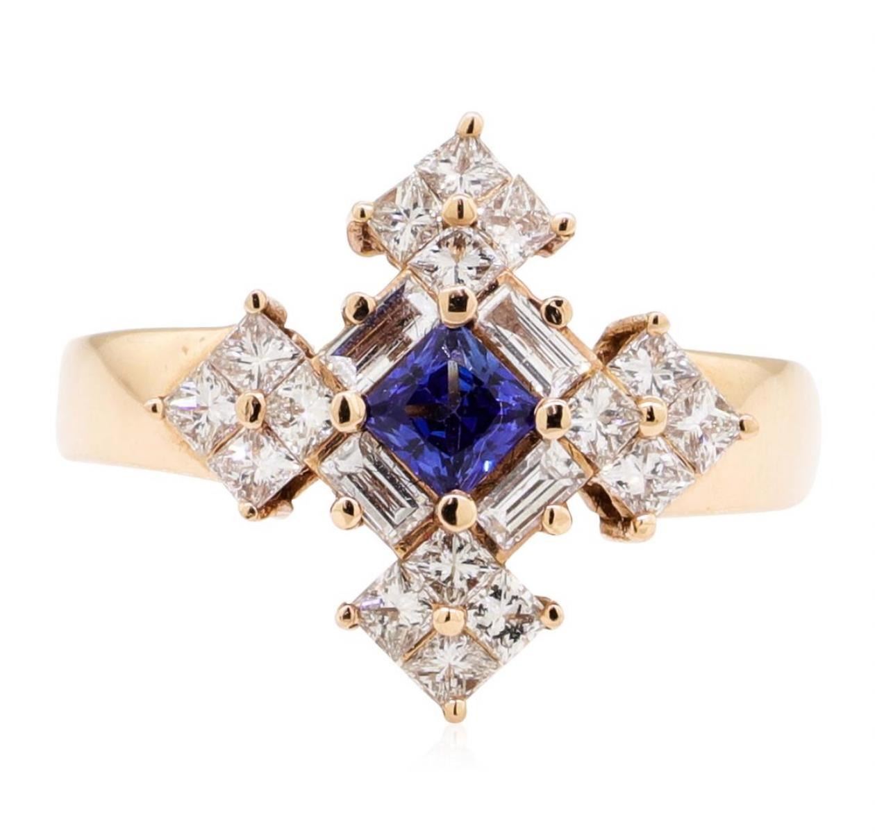 One electronically tested 14KT rose gold lady's cast fashion ring with a cross motif with a bright polish finish. The featured lady's ring has a shank measuring 2.60 millimeters wide. Identified with markings of '14K'. Condition is new, good workmanship. Containing: One prong set princess modified brilliant cut natural blue sapphire, measuring 3.73 x 3.70 x 2.41mm, (depth est.) approximate weight of 0.32ct., clarity is eye clean, medium, strong, blue color, (GIA B 5/5), cut is very good. Transmitting light with no distortion, transparent. Colored gemstones are presumed to have been subjected to commonly used enhancement processes. Graded in the setting. Four prong set baguette cut diamonds, measuring from 3.15 x 1.40 x 1.19mm (depth est.) to 3.20 x 1.45 x 1.24mm (depth est.) approximate total weight of 4 Stones = 0.20ct. Graded in the setting. Color G - H Clarity VS-2 to SI-1 Cut Very Good Sixteen prong set princess cut diamonds, measuring 1.90 x 1.85 x 1.39mm (depth est.) approximate total weight of 16 Stones = 0.64ct. Graded in the setting. Color G - H Clarity VS-2 to SI-1 Cut Very Good. Total Weight of Colored Stones 0.32ct.. Total Weight of Diamonds 0.84ct.. Total Weight of Ring 4.60gm GAS Appraised at $3270.00. GAS Appraised.
