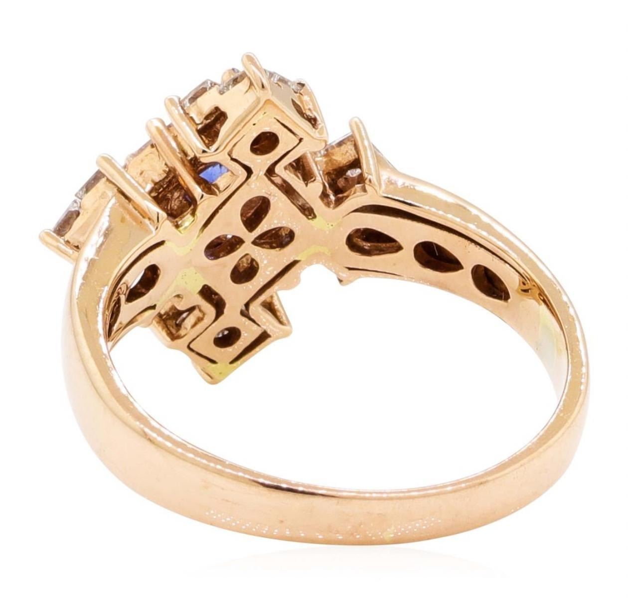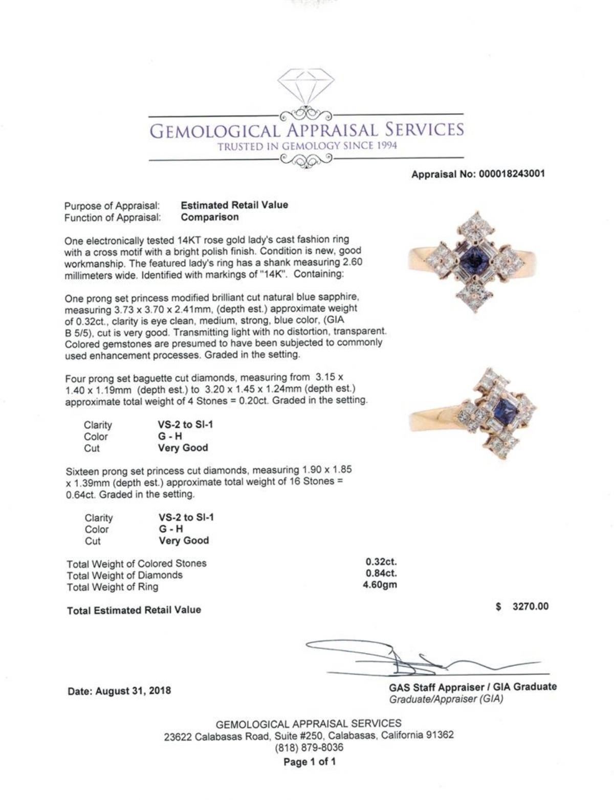 One electronically tested 14KT rose gold lady's cast fashion ring with a cross motif with a bright polish finish. The featured lady's ring has a shank measuring 2.60 millimeters wide. Identified with markings of '14K'. Condition is new, good workmanship. Containing: One prong set princess modified brilliant cut natural blue sapphire, measuring 3.73 x 3.70 x 2.41mm, (depth est.) approximate weight of 0.32ct., clarity is eye clean, medium, strong, blue color, (GIA B 5/5), cut is very good. Transmitting light with no distortion, transparent. Colored gemstones are presumed to have been subjected to commonly used enhancement processes. Graded in the setting. Four prong set baguette cut diamonds, measuring from 3.15 x 1.40 x 1.19mm (depth est.) to 3.20 x 1.45 x 1.24mm (depth est.) approximate total weight of 4 Stones = 0.20ct. Graded in the setting. Color G - H Clarity VS-2 to SI-1 Cut Very Good Sixteen prong set princess cut diamonds, measuring 1.90 x 1.85 x 1.39mm (depth est.) approximate total weight of 16 Stones = 0.64ct. Graded in the setting. Color G - H Clarity VS-2 to SI-1 Cut Very Good. Total Weight of Colored Stones 0.32ct.. Total Weight of Diamonds 0.84ct.. Total Weight of Ring 4.60gm GAS Appraised at $3270.00. GAS Appraised.