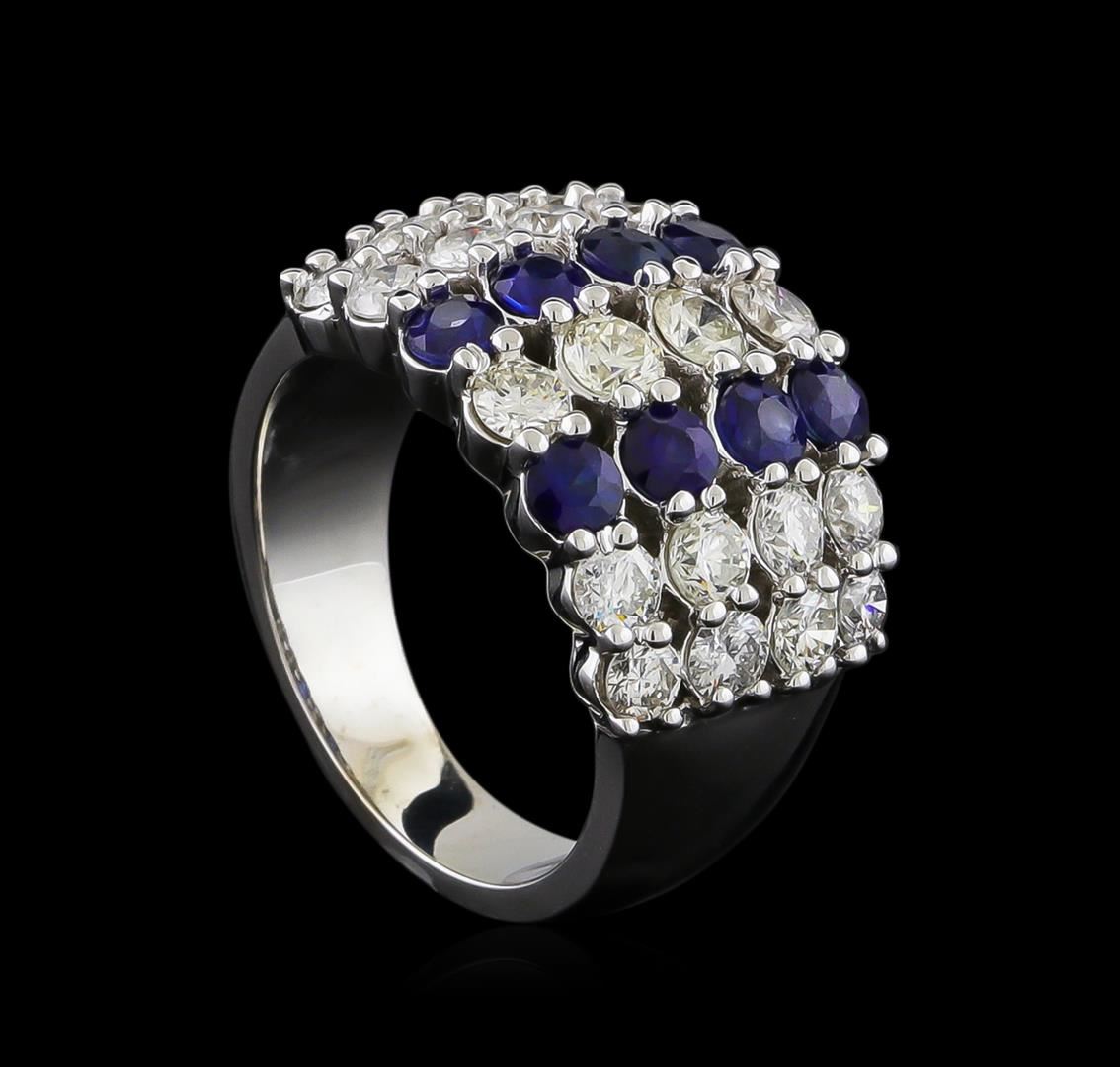 One electronically tested 14KT white gold lady's cast fashion ring with a tapered shank with a bright polish finish. The featured lady's ring has a four row wide band motif with a shank measuring 4.21 millimeters wide. Identified with markings of "14K". Condition is new, good workmanship. Containing: Eight prong set round modified brilliant cut natural blue sapphires, measuring 3.00 - 2.90 x 1.92 mm, approximate total weight of 1.16ct., clarity is slightly included, type II, medium dark, moderately strong, blue color, (GIA B 6/4), cut is good. Transmitting light with a minimum of distortion, transparent. Colored gemstones are presumed to have been subjected to commonly used enhancement processes. Graded in the setting. Four prong set round brilliant cut diamonds, measuring 3.10 - 3.05 x 1.91mm (depth est.) approximate total weight of 4 Stones = 0.44ct. Graded in the setting. Clarity: SI-2 to I-1. Color: H - I. Cut Good Sixteen prong set round brilliant cut diamonds, measuring 2.90 - 2.70 x 1.71mm (depth est.) approximate total weight of 16 Stones = 1.30ct. Graded in the setting. Clarity: SI-1 to I-1. Color: H - I. Cut Good. Total Weight of Colored Stones 1.16ct. Total Weight of Diamonds 1.74ct. Total Weight of Ring 9.60gm. GAS Appraised at $5,970.00.