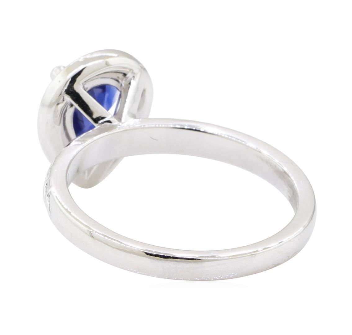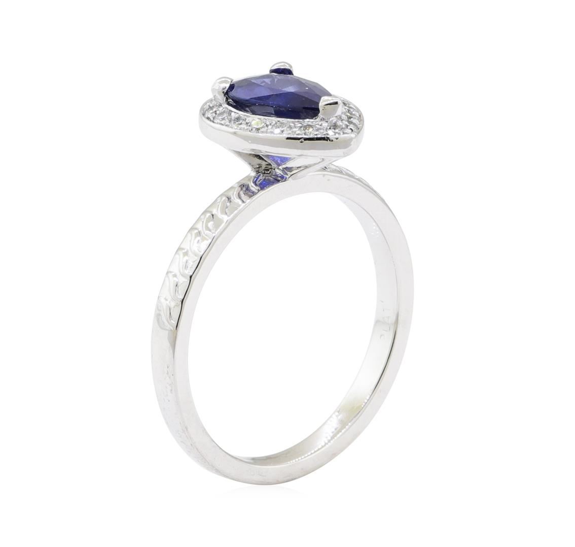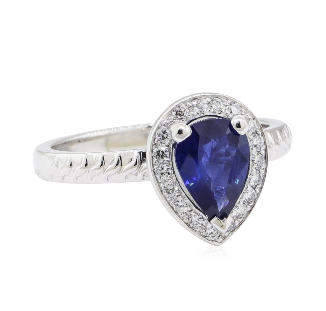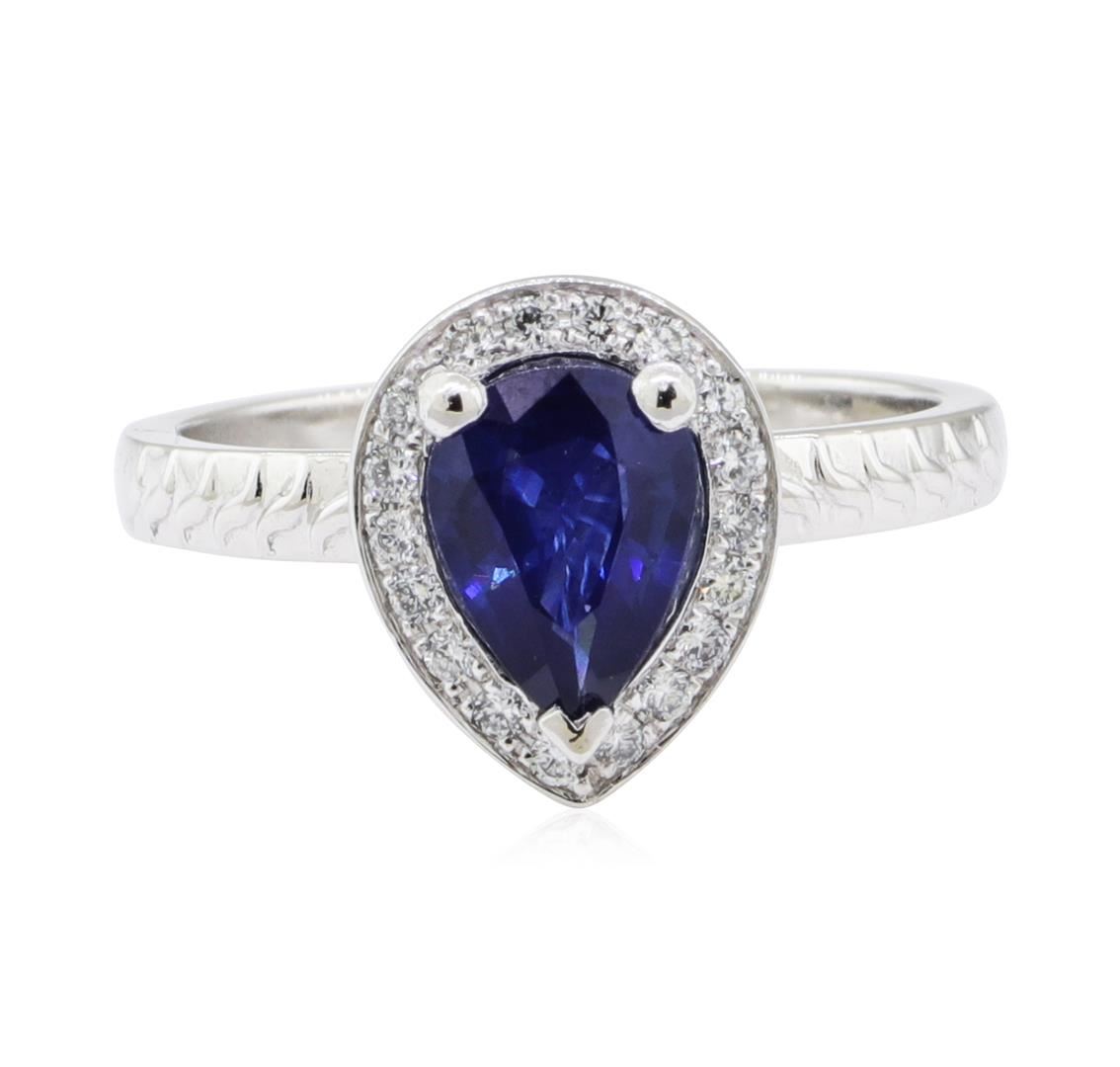 One ring featuring: platinum weighing 6.1 grams containing one pear shaped sapphire weighing 1.01ct and seventeen diamonds weighing 0.15ctw.