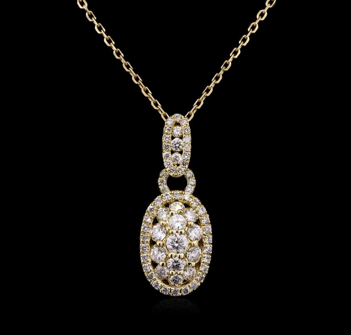 One electronically tested 14KT yellow gold lady's combination cast & assembled fashion pendant & chain 16.0" long, 1mm diamond cut cable link with a lobster claw clasp with a bright polish finish. Identified with markings of "K14". Condition is new, good workmanship. Containing: One prong set round brilliant cut diamond, measuring 3.20 - 3.18 x 1.92mm (depth est.) approximate weight of 0.12ct. Graded in the setting. Clarity: SI-2. Color: Very Good Thirteen prong set round brilliant cut diamonds, measuring 2.50 - 2.45 x 1.49mm (depth est.) approximate total weight of 13 Stones = 0.70ct. Graded in the setting. Clarity: SI-1 to SI-2. Color: H - I. Cut Good Forty-Nine prong set round brilliant cut diamonds, measuring 1.30 - 1.20 x 0.73mm (depth est.) approximate total weight of 49 Stones = 0.34ct. Graded in the setting. Clarity: SI-1 to I-1. Color: H - I. Cut Good. Total Weight of Diamonds 1.16ct. Total Weight of Pendant & Chain 4.50gm. GAS Appraised at $4,035.00.