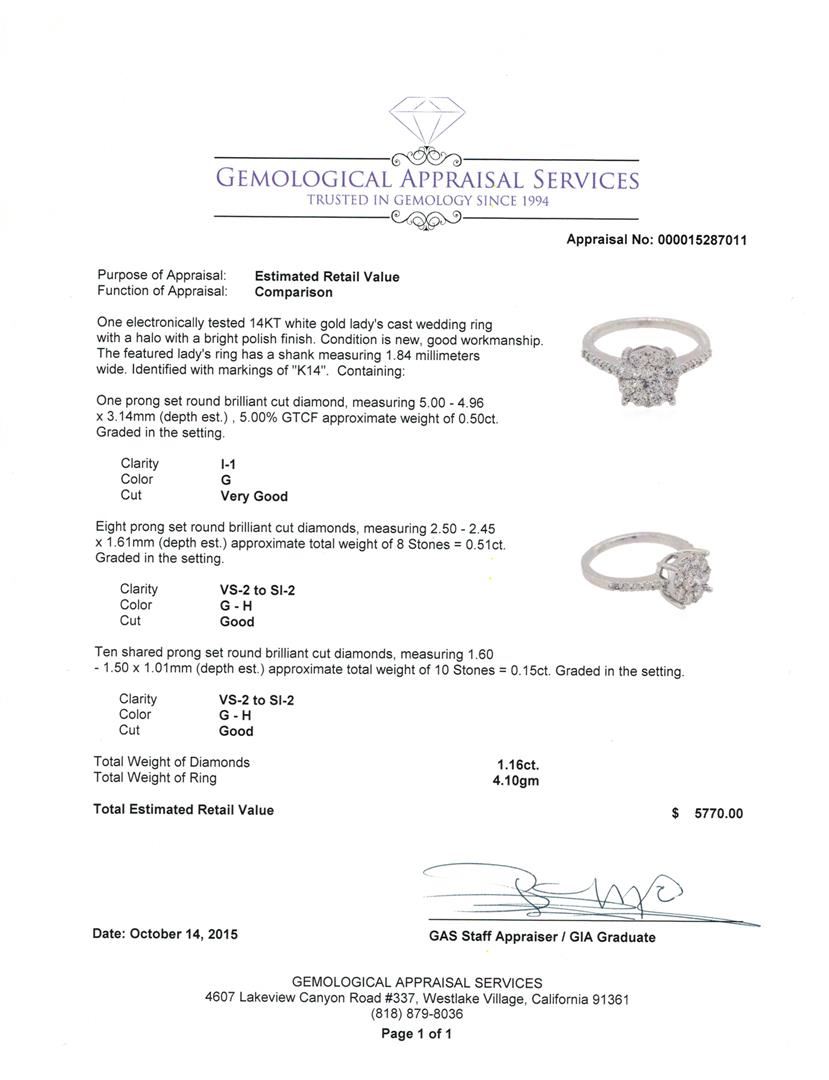 One electronically tested 14KT white gold lady's cast wedding ring with a halo with a bright polish finish. The featured lady's ring has a shank measuring 1.84 millimeters wide. Identified with markings of "K14". Condition is new, good workmanship. Containing: One prong set round brilliant cut diamond, measuring 5.00 - 4.96 x 3.14mm (depth est.) , 5.00% GTCF approximate weight of 0.50ct. Graded in the setting. Clarity: I-1. Color: G. Cut Very Good Eight prong set round brilliant cut diamonds, measuring 2.50 - 2.45 x 1.61mm (depth est.) approximate total weight of 8 Stones = 0.51ct. Graded in the setting. Clarity: VS-2 to SI-2. Color: G - Good Ten shared prong set round brilliant cut diamonds, measuring 1.60 - 1.50 x 1.01mm (depth est.) approximate total weight of 10 Stones = 0.15ct. Graded in the setting. Clarity: VS-2 to SI-2. Color: G - Good. Total Weight of Diamonds 1.16ct. Total Weight of Ring 4.10gm. GAS Appraised at $5,770.00.