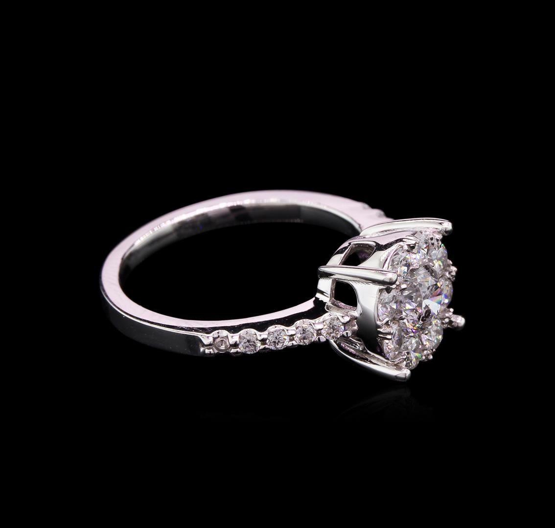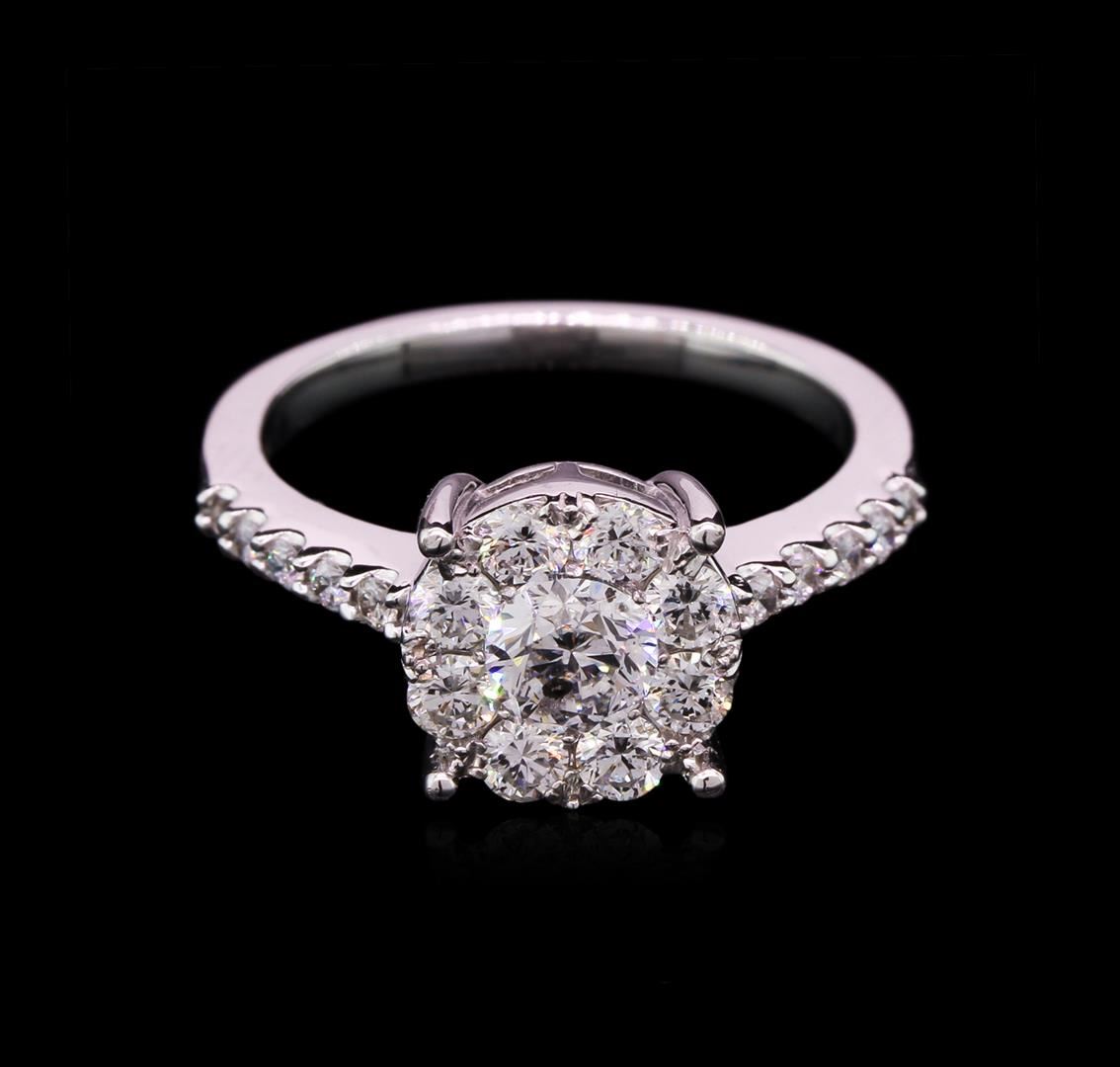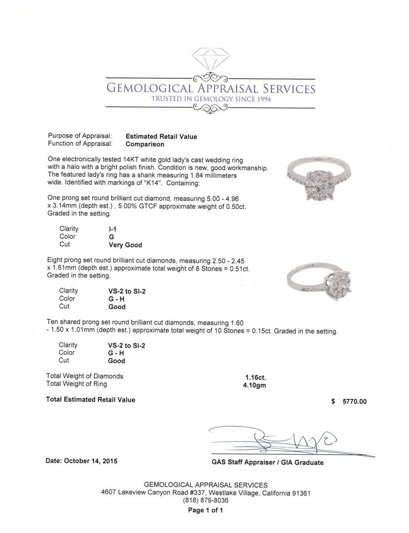 One electronically tested 14KT white gold lady's cast wedding ring with a halo with a bright polish finish. The featured lady's ring has a shank measuring 1.84 millimeters wide. Identified with markings of "K14". Condition is new, good workmanship. Containing: One prong set round brilliant cut diamond, measuring 5.00 - 4.96 x 3.14mm (depth est.) , 5.00% GTCF approximate weight of 0.50ct. Graded in the setting. Clarity: I-1. Color: G. Cut Very Good Eight prong set round brilliant cut diamonds, measuring 2.50 - 2.45 x 1.61mm (depth est.) approximate total weight of 8 Stones = 0.51ct. Graded in the setting. Clarity: VS-2 to SI-2. Color: G - Good Ten shared prong set round brilliant cut diamonds, measuring 1.60 - 1.50 x 1.01mm (depth est.) approximate total weight of 10 Stones = 0.15ct. Graded in the setting. Clarity: VS-2 to SI-2. Color: G - Good. Total Weight of Diamonds 1.16ct. Total Weight of Ring 4.10gm. GAS Appraised at $5,770.00.