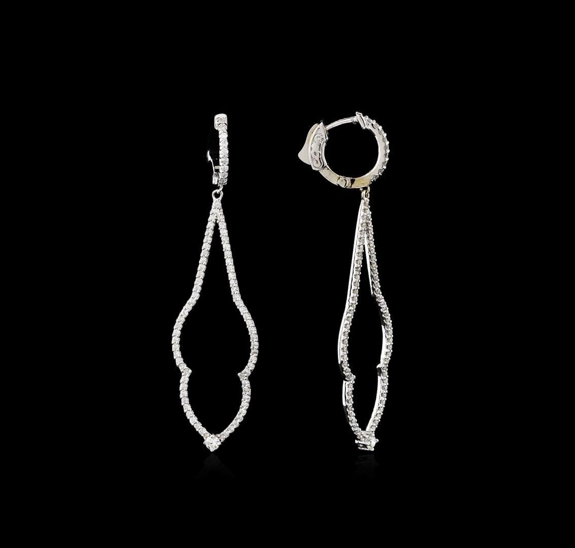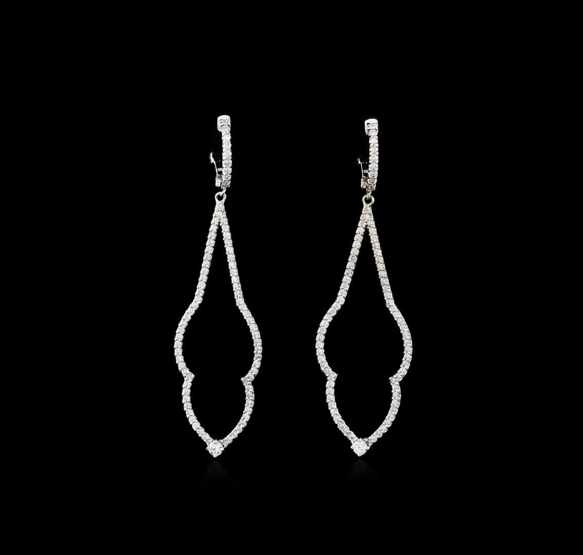 One pair electronically tested 14KT white gold lady's combination cast & assembled dangle earrings with hinged clip backs with a bright polish finish. Identified with markings of "K14". Condition is new, good workmanship. Containing: Two prong set round brilliant cut diamonds, measuring 2.70 - 2.60 x 1.64mm (depth est.) approximate total weight of 2 Stones = 0.14ct. Graded in the setting. Clarity: SI-1 to SI-2. Color: Very Good Eighteen prong set round brilliant cut diamonds, measuring 1.30 - 1.25 x 0.81mm (depth est.) approximate total weight of 18 Stones = 0.15ct. Graded in the setting. Clarity: SI-1 to I-1. Color: H - I. Cut Good One Hundred Thirty-Six prong set round brilliant cut diamonds, measuring 1.20 - 1.15 x 0.74mm (depth est.) approximate total weight of 136 Stones = 0.88ct. Graded in the setting. Clarity: SI-1 to I-1. Color: H - I. Cut Good. Total Weight of Diamonds 1.17ct. Total Weight of Earrings 7.20gm. GAS Appraised.